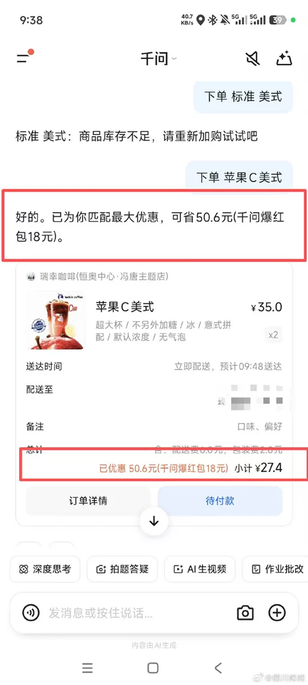 把点外卖复杂的搜索、比价、领券流程封装进一句简单的 AI 提示词里,用利益快速拉高千问 App 的安装量,也让普通用户迅速意识到:「原来 AI 就是一句话就能完成一件事的工具!」,普及效果杠杠的。
