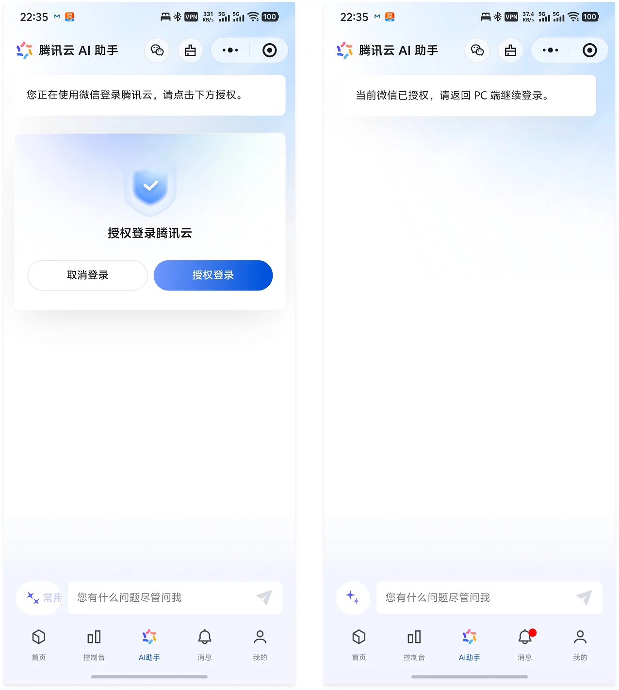 在用户扫码登录腾讯云网站时,手机上并没有跳转到传统的「授权确认」H5 页面,而是直接将用户引导至「腾讯云 AI 助手」的交互界面,将授权确认功能植入到 AI 助手里面,当作一次对话,强制完成一次品牌露脸。
