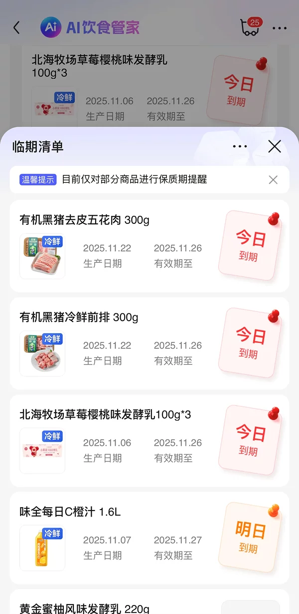 每次扔掉冰箱里过期的食物,就心疼又自责——明明买的时候还信心满满要好好吃饭,怎么又浪费了? 叮咚买菜 App 内置的AI 饮食管家中的临期清单功能就能监控你在叮咚买菜上购买的食品的保质期。临期前会收到 App 内推送。