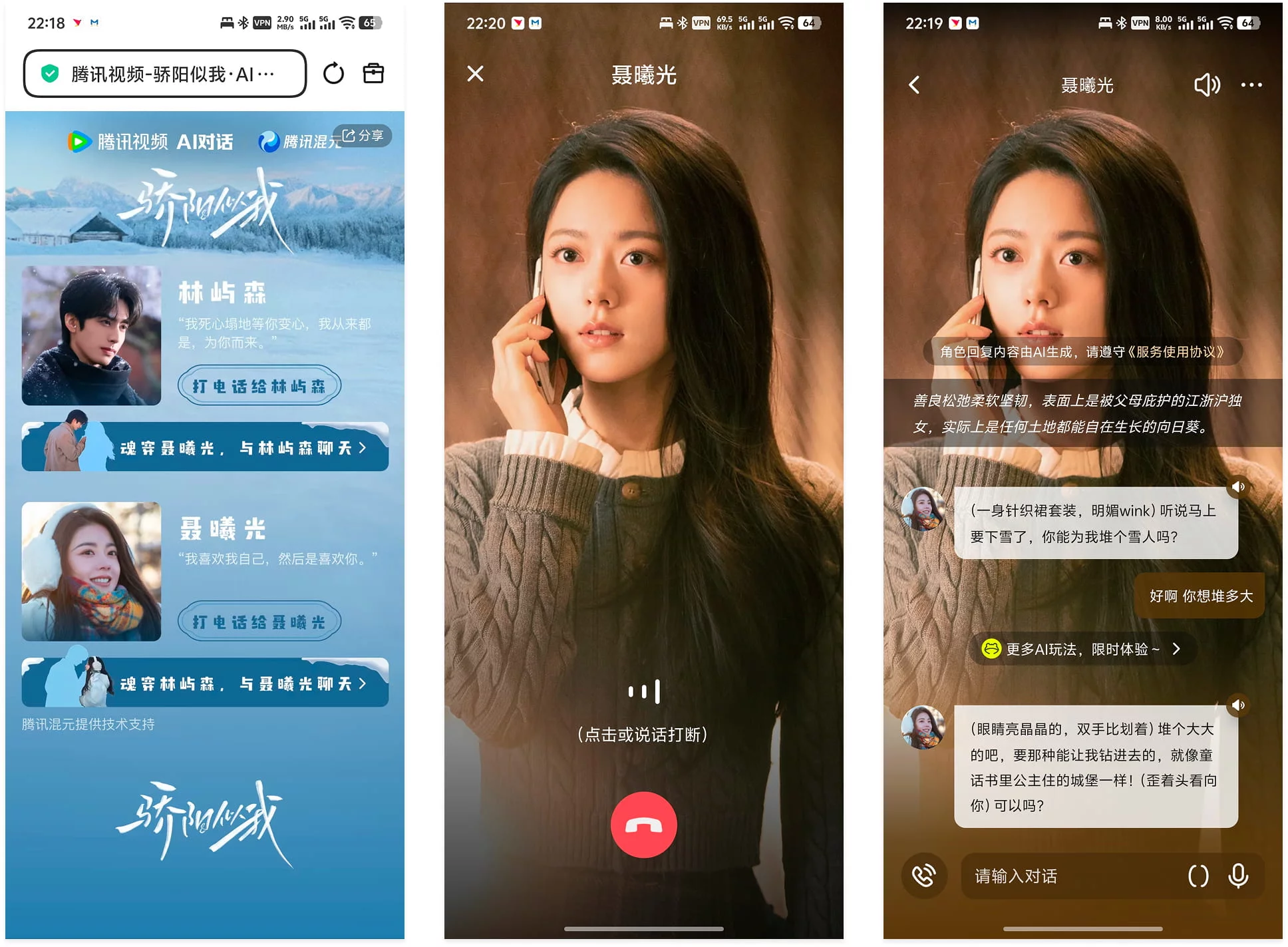 腾讯视频为热播剧《骄阳似我》定制的 AI 互动玩法。将剧中角色「林屿森」和「聂曦光」转化为可对话的 AI 分身,让观众在观看剧情之余,能通过「打电话」或「文字聊天」的方式,与角色进行深度交流。AI 的回复不仅仅是文字,还夹杂着「(眼睛亮晶晶的,双手比划着)」这类带有情绪描写的舞台指导语,让交互显得更有「人味」。