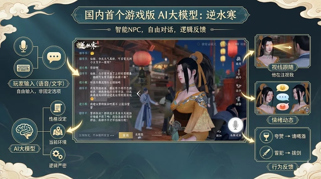 以前玩游戏时,和游戏里的 NPC 对话通常只能从几个固定选项里选择互动。而《逆水寒》把 AI 植入 NPC,让你可以直接输入任意文字或语音与 NPC 对话。NPC 会基于自身的人设和当时的环境,逻辑严密地接住你的话,甚至给出相应的动作反馈。