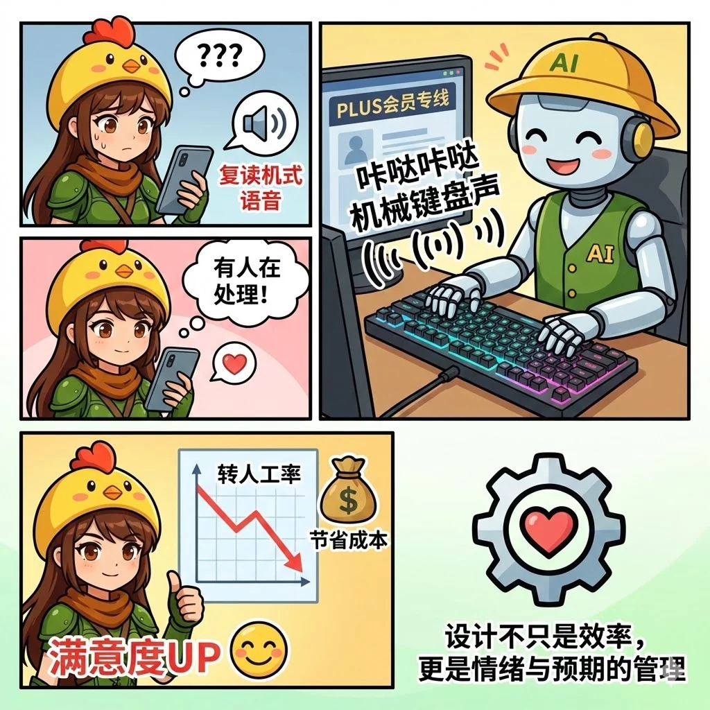 这个花招就是:在通话间隙加入一段高度拟真的机械键盘敲击声。用声音信号营造「真人正在后台操作」的现场感,让用户以为对方正在忙着处理问题,从而缓解等待时的不确定感。