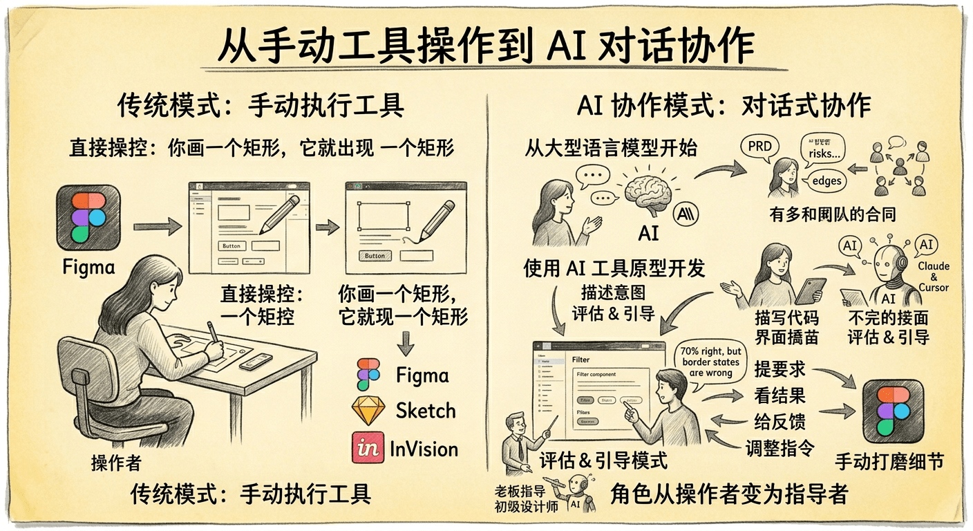从前你是一笔一划地画,而现在不断地提要求、看结果、给反馈、再调整。可以类比成你是老板,招聘了一个初级设计师,他在你的指导下进行工作。设计师和工具之间从「手动执行」变成了「对话式协作」。