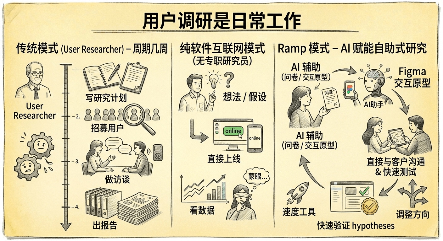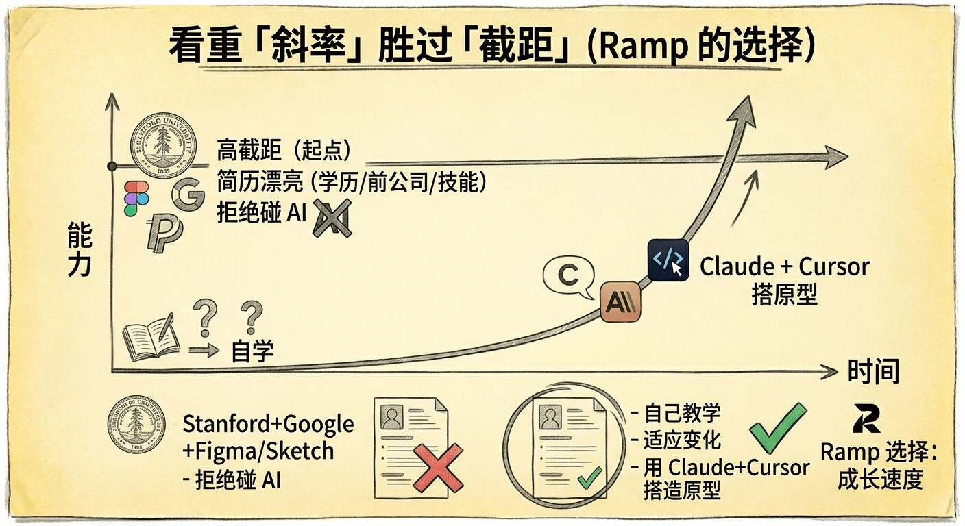 现在整个行业都在快速转型,今天会的东西半年后可能就过时了。一个简历漂亮但拒绝碰 AI 的设计师,和一个非科班但已经在用 Claude + Cursor 搭原型的设计师之间,Ramp 明确告诉你他们选后者。对正在焦虑的设计师来说,这其实是一句挺鼓励人的话—— 你的过去不重要,你的加速度才重要。