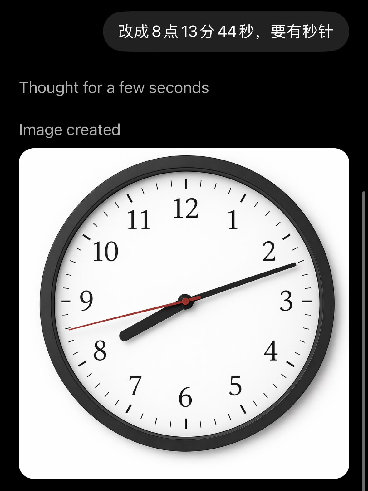 X 网友 @Tz_2022 让 GPT Image 2 生成 8:13:44 这种具体时间,说明新模型在细粒度空间理解和数学/几何推理上的进步,而不是单纯靠训练数据里的常见图案去猜。