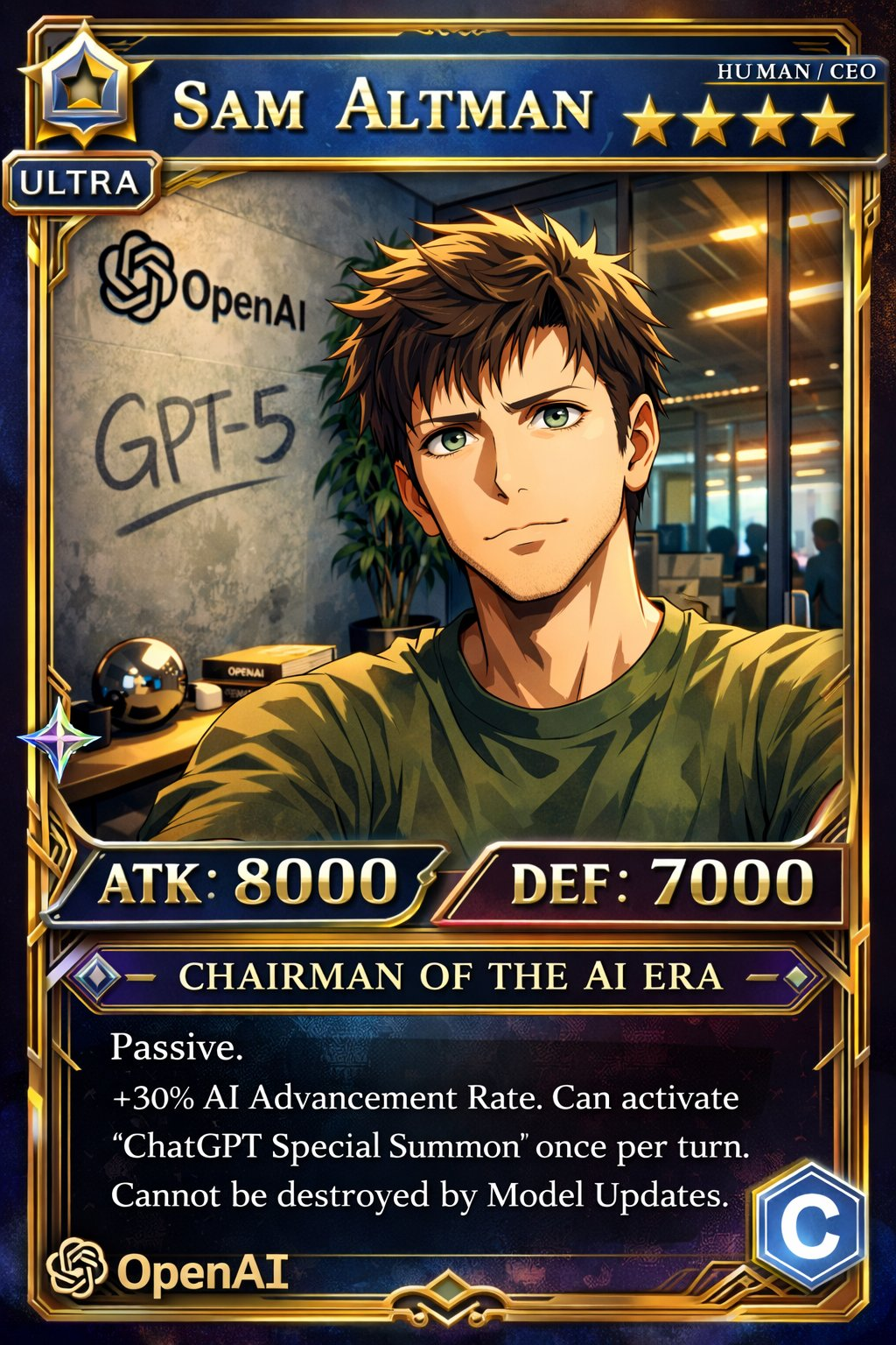 @mjlbach 还发现 GPT Image 2 的有点幽默感:让GPT Image 2 用 ChatGPT CEO Sam Altman 的形象生成一张游戏卡牌,这个新模型把 Sam Altman 封为 「AI 时代主席」(Chairman of the AI Era),像政治领袖一样。还配上夸张的 ATK/DEF 和稀有度,让Sam Altman看上去像是一个很难抽到的稀有角色,