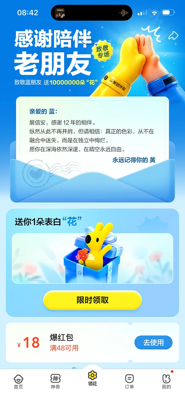 视觉上,它一反常态地没有使用品牌主色调美团黄,而是采用了大面积的蓝色——这正是其竞争对手饿了么的标志色,第一时间就营造出一种特殊的氛围。页面的核心文案「感谢陪伴,老朋友」,配以「致敬蓝朋友」的小字,直接点明主题。画面中,一只戴着美团外卖手环的黄色手套与一只蓝色手套紧紧握在一起,象征着两家平台多年的竞争与陪伴。下方是一封信件,抬头写着「亲爱的蓝」,内容表达了对12年相伴的感谢,并传达了「真正的色彩,从不在融合中迷失,而是在独立中绚烂」的价值观,这文案水平,放在朋友圈能收获一堆点赞。