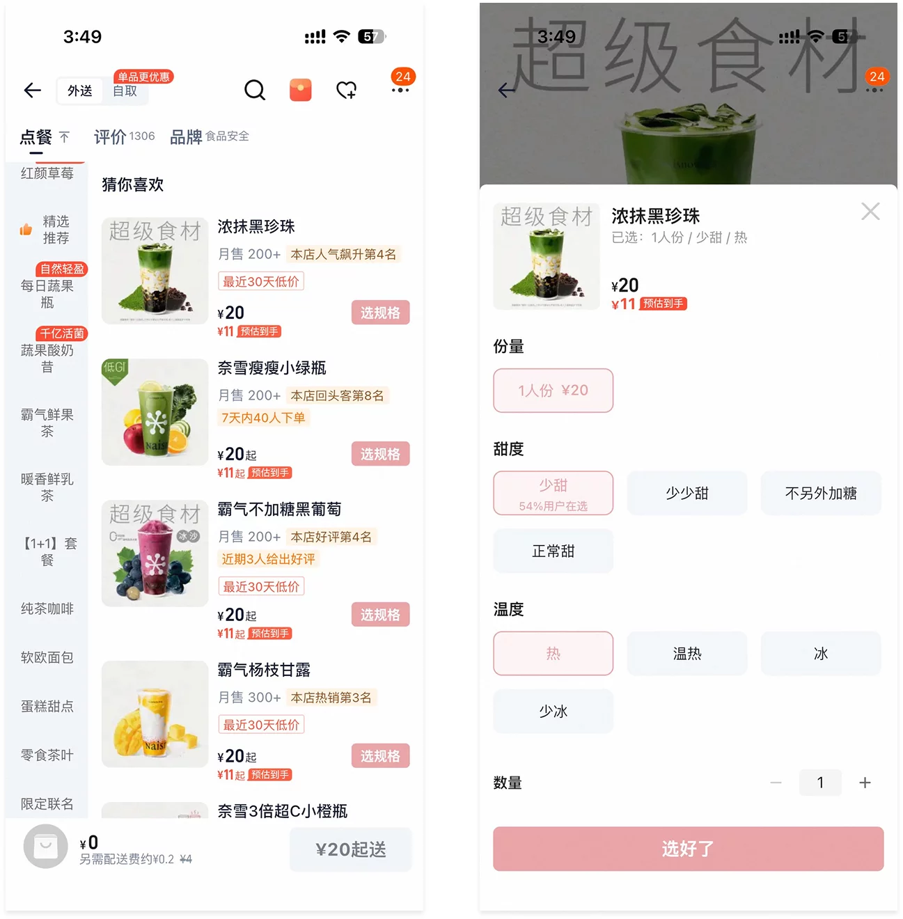 在点餐列表页,核心的行动号召(CTA)按钮「选规格」变成了浅粉色背景配白色文字。进入商品详情页后,规格选择项在选中状态下也采用了同样的粉色边框和文字。最关键的是,在用户完成所有选择后,底部的确认按钮「选好了」也使用了这个粉色作为填充色。