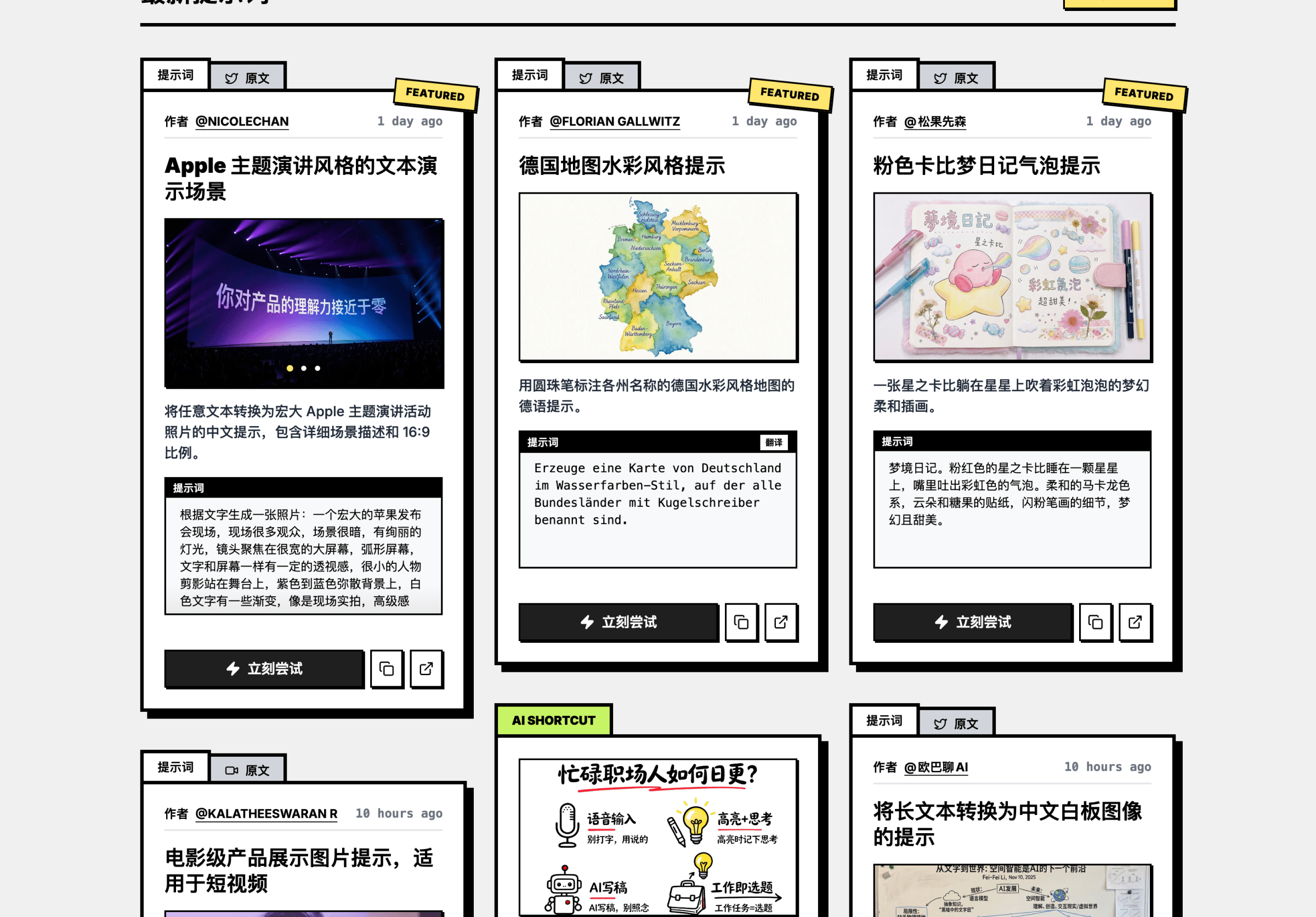 提供精选的高质量 AI 提示词,旨在帮助用户在创作过程中获取灵感。通过这些提示词,用户可以生成多样化的图像,从宏大的发布会场景到独特的角色设计,满足不同需求。