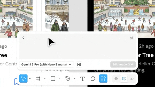 在Figma里选中一张阳光明媚的插画,选择Nano Banana Pro并输入了简单的指令「Make this a night time」(把它变成夜晚)。 紧接着,AI 并不是简单地降低亮度或覆盖滤镜,而是仿佛给画面按下了真实的开关:天空瞬间切换为星夜,建筑物内部透出温暖的灯光,圣诞树和滑冰场也披上了晚上的氛围。最关键的是,原图的构图、人物细节和透视关系被100%保留。