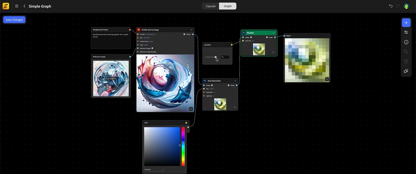 这一情况将迎来终结,Adobe 近期推出的 Project Graph,这是一款AI 驱动的工作流创意工具,通过可视化节点编辑器,你可以把Adobe旗下所有软件作为工作流的某个节点。通过一个工作流解决所有问题。 不需要启动 Photoshop,只需在搜索栏输入指令,就能直接抓取 PS 的「像素化」滤镜;不需要打开 Firefly 网页版,就能直接拖拽出 AI 生图模块。 曾经割裂在不同图标里的功能,现在变成了画布上一个个平等的、可随意串联的节点(Nodes)。从输入参考图,到 AI 生成,再到后期调色,整个全家桶的能力被拆解成了原子级的积木,通过连线即可无缝数据流转。