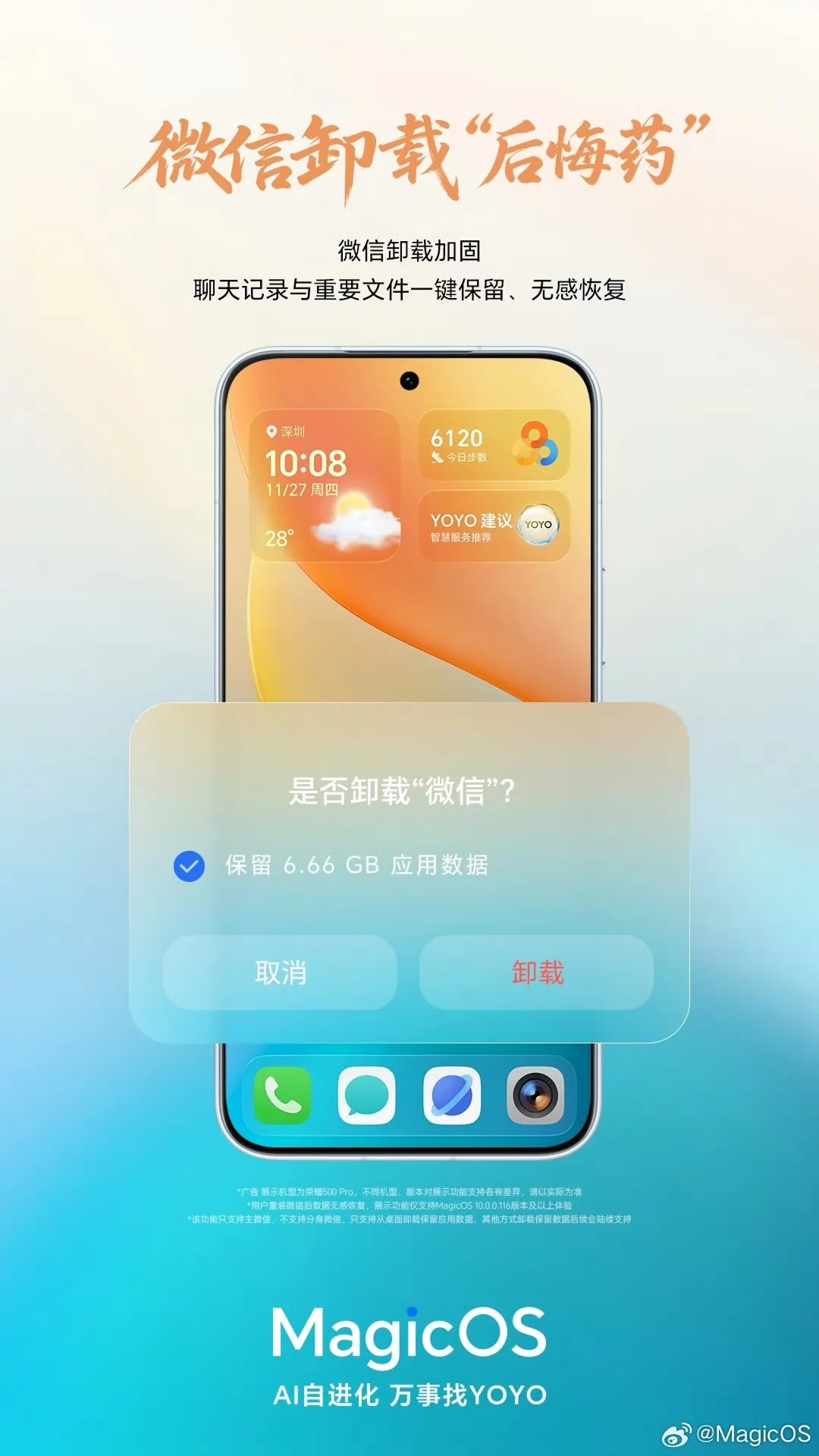荣耀 MagicOS 卸载应用时可保留数据,避免误删聊天记录