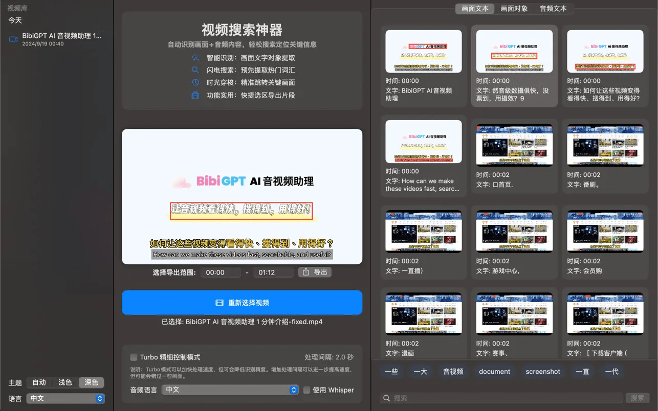 通过智能文字识别和快速搜索功能,用户能轻松定位视频中的关键信息。无需联网,支持中文和英文,功能包括热词推荐、可视化结果展示和多格式支持,适合学习、研究、内容创作等多种场景。