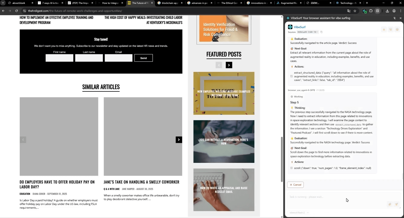 VibeSurf 能够同时在多个浏览器标签页运行 AI Agent,从而显著加快研究和任务执行的速度。用户可以自定义工作流,创建拖放式和基于对话的操作,以实现复杂的浏览器自动化任务。