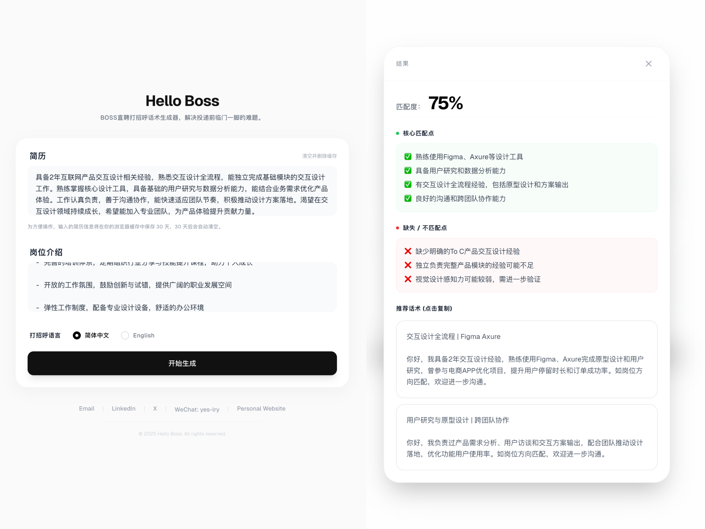 帮助求职者在投递简历前,轻松解决与招聘者沟通的难题。通过智能分析简历与职位描述的匹配度,系统能够生成具有高回复率的打招呼语言,让求职者在竞争激烈的市场中脱颖而出。只需输入简历信息,便可获得定制化的交流话术,提升求职成功率。