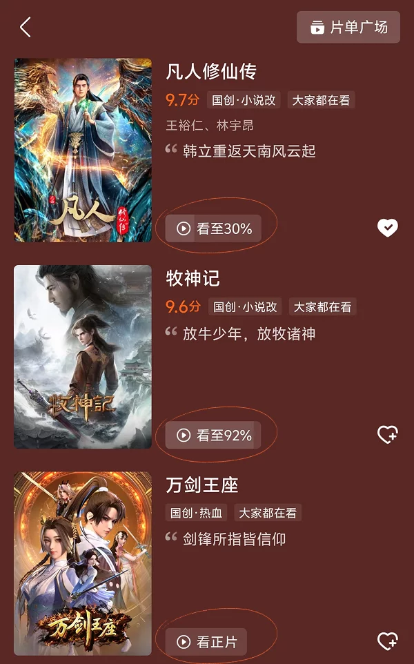 如何在列表页优雅地展示「观看进度」,既不干扰封面,又足够清晰? B 站(哔哩哔哩)番剧列表页。设计师做了一个极其聪明的减法。播放按钮本身变成了一个进度容器,半透明的灰白色背景作为底槽,而淡白色的填充色块则充当了进度的实体。对于没过的剧,按钮安安静静地显示为「看正片」,已经看过的剧,按钮内部的色块像水位一样上涨,并显示观看进度百分比。 将「CTA(行动号召)按钮」与「Progress Bar(进度条)」合体,消除了列表页常见的视觉噪音。在有限的卡片高度内,既保证了封面的完整展示,又提供了关键决策信息。