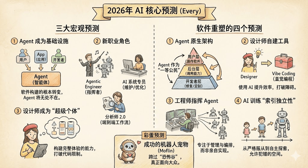 Every 分享了他们对 2026 年 AI 发展的看法,认为这将是软件开发的一个大变革。首先,AI 代理将成为软件的基础设施,用户可以用它来做任何应用能做到的事情。想象一下,以后开发者的工作可能完全交给 AI 来做,程序员变成了 “Agentic Engineer”,专注于管理这些智能代理,而不是写代码。