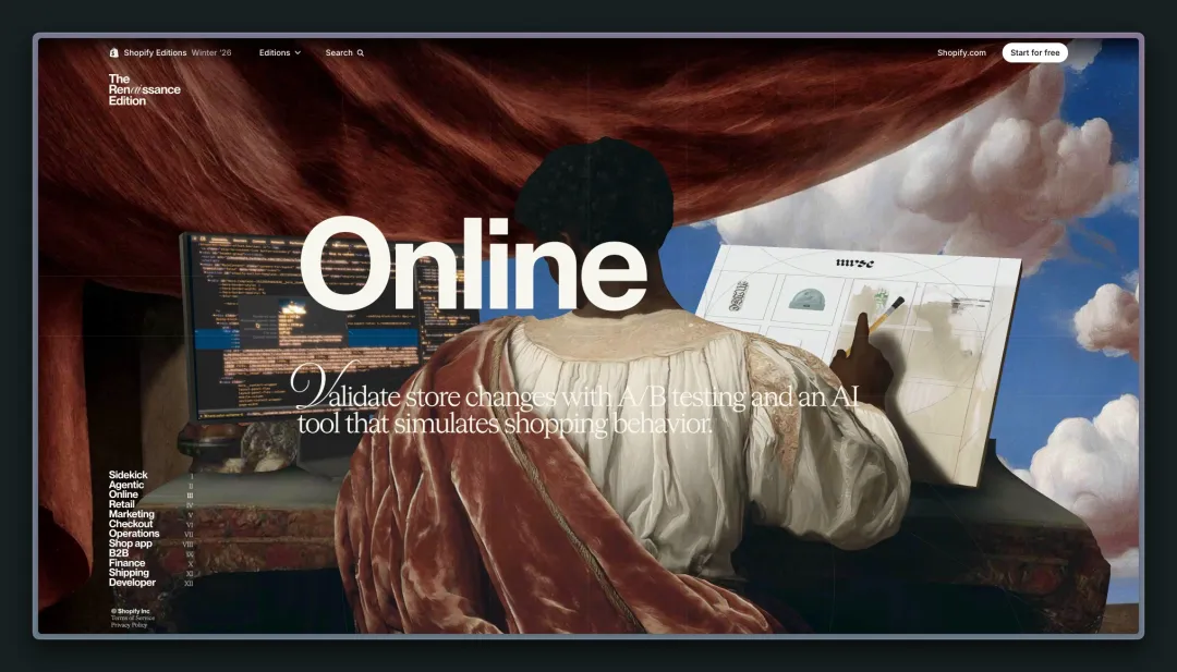 Shopify 发布了冬季更新的网页,整体设计风格融合了文艺复兴的古典与现代元素,让人眼前一亮。网页首屏用复古配色和油画风格的插图吸引了众多目光,还有各种细腻的交互效果,比如鼠标悬停时的动态变化,真是让人玩得不亦乐乎。