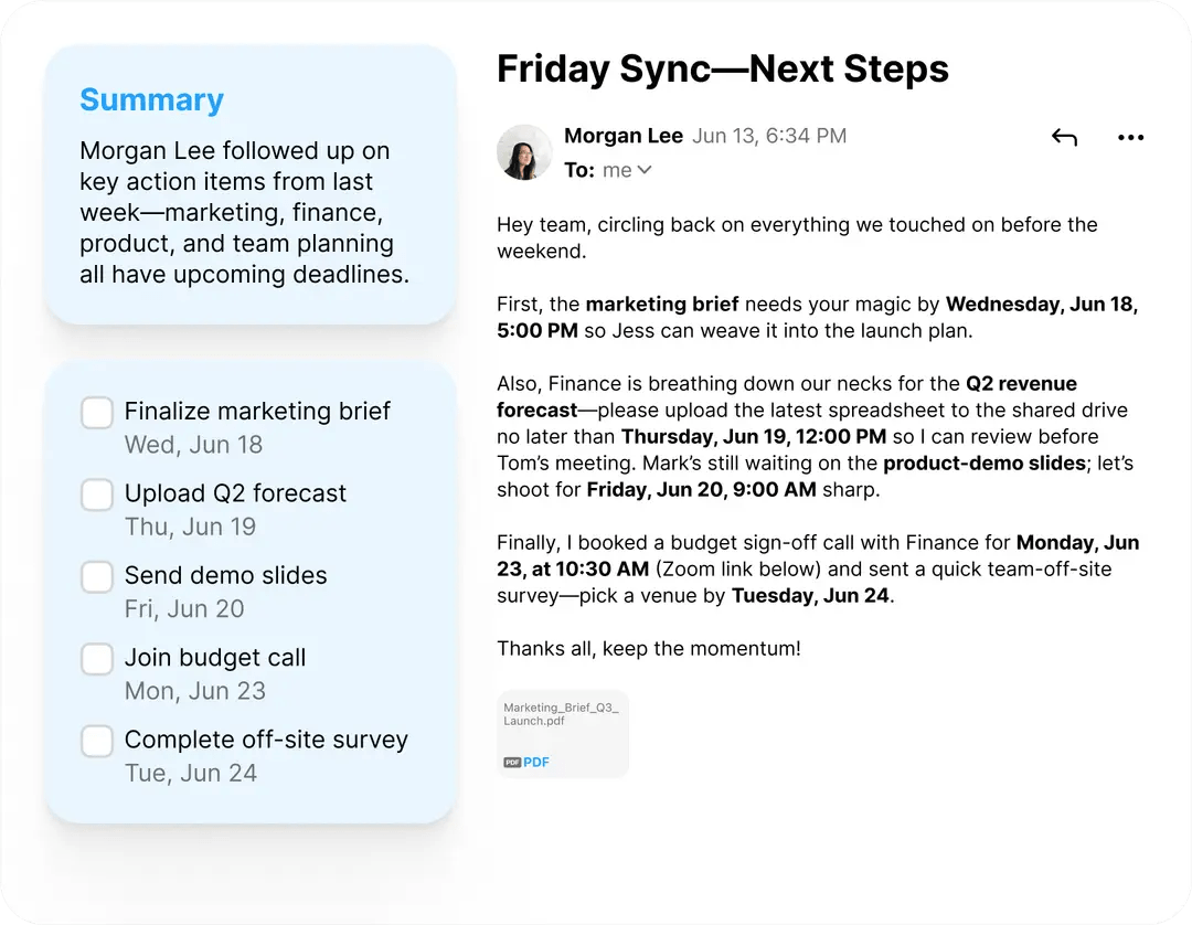 通过 AI 技术自动处理邮件回复、总结信息和提取待办事项,帮助用户节省时间和精力。
