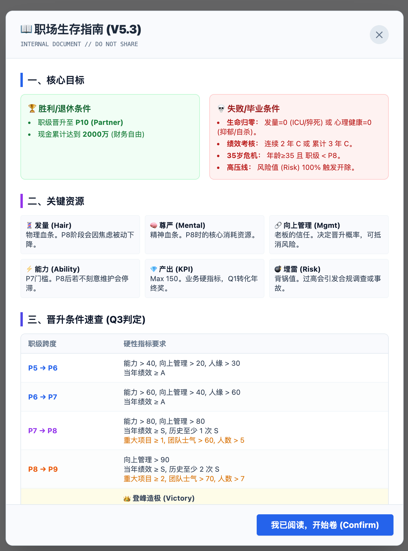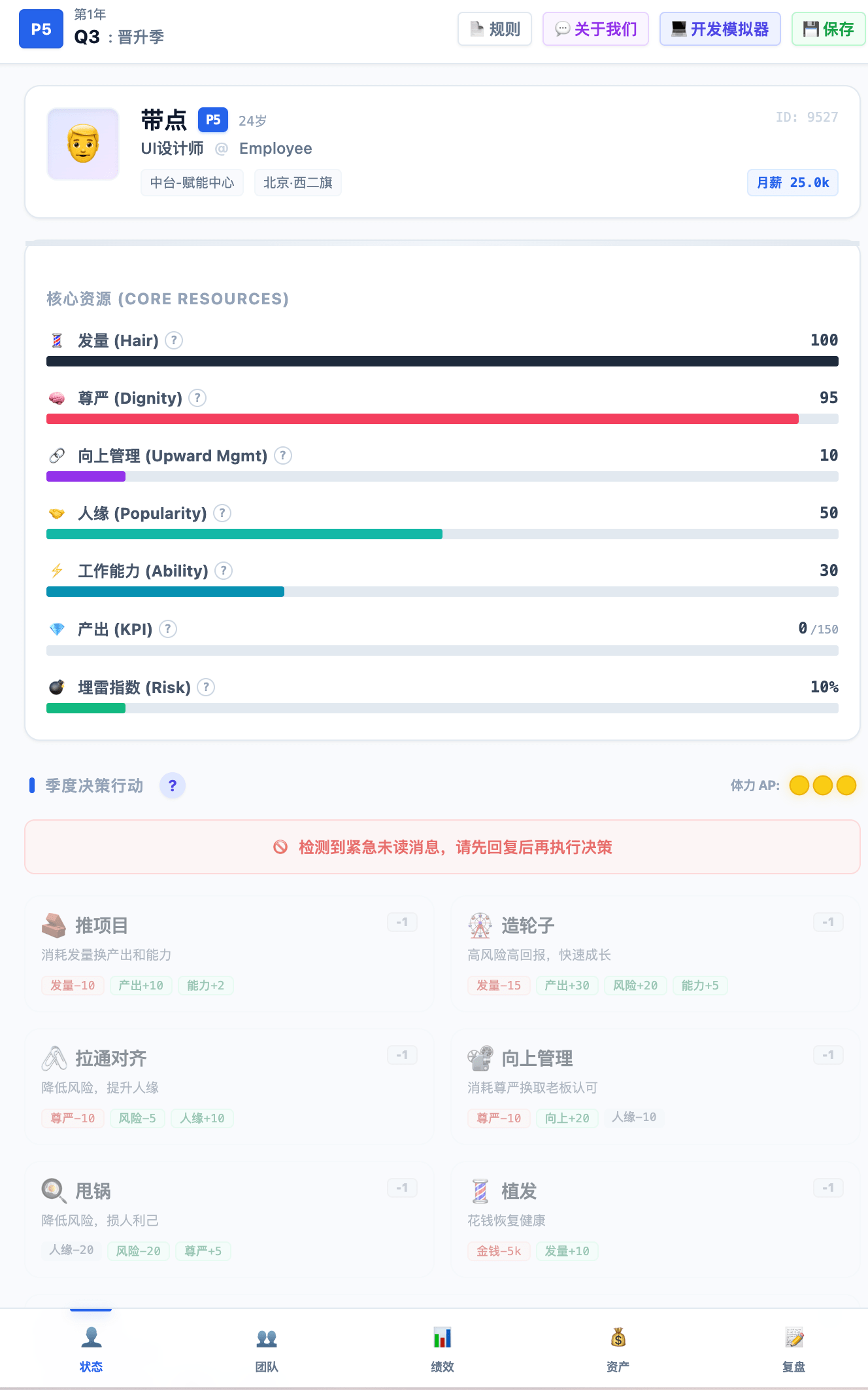 游戏设定了很多晋升条件,比如从 P5 升到 P6 需要 “能力” 超过 40,还得在绩效上拿到 A。如果你觉得这些指标听起来熟悉,那是因为它们映射了现实中的职场压力。