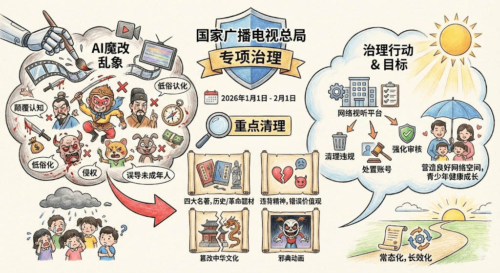 国家广播电视总局决定从 2026 年 1 月 1 日开始,开展为期一个月的 “AI 魔改” 视频专项治理。这波操作是为了整治那些利用 AI 工具对经典影视和动画进行恶搞和低俗改编的视频,毕竟这些内容已经严重扭曲了原作的精神,让人难以接受。