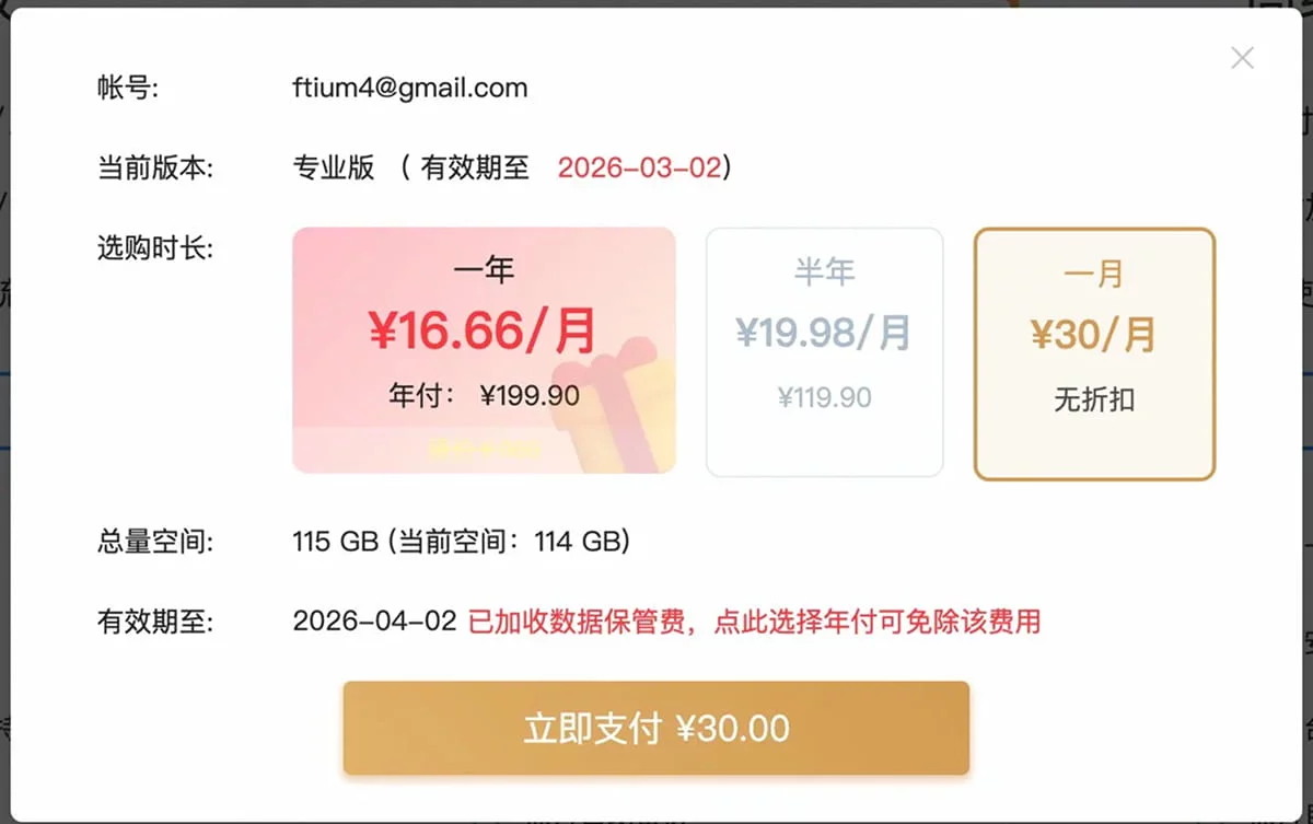 坚果云会员过期后续费,月付选项标注「无折扣」不说,而且月付还要加收数据保管费,年付才能免除该费用。 这是一个负向激励设计,核心机制是损失厌恶。「省50块」和「多花50块」在经济学上等价,但心理感受上后者的推动力大约是前者的两倍。保管费这个概念把一个本来不存在的成本显性化了——你的数据一直存着,以前你不觉得这是成本,现在突然变成了一笔「费用」,损失感凭空制造出来了。