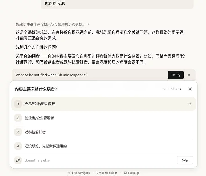 整个 AI 行业现在有个通病:过度服从。你说什么就做什么,哪怕你的需求模糊、有矛盾、甚至方向就是错的。 问题不在 AI 的输出质量,在于一开始就没对齐需求。Claude 就很棒,在我提问之后,先追问,我不用打字,点点选选就把需求补充完整清楚了。 Claude 抓到了一个被同行集体忽略的需求:用户其实不知道自己要什么。大多数 AI 产品的解法像是猜客户需求拍用户马屁,Claude 换了个思路——与其猜,不如问。所有人都在拼模型能力的时候,敢在交互层面做文章、让用户先停下来想一想,这个产品判断需要勇气。