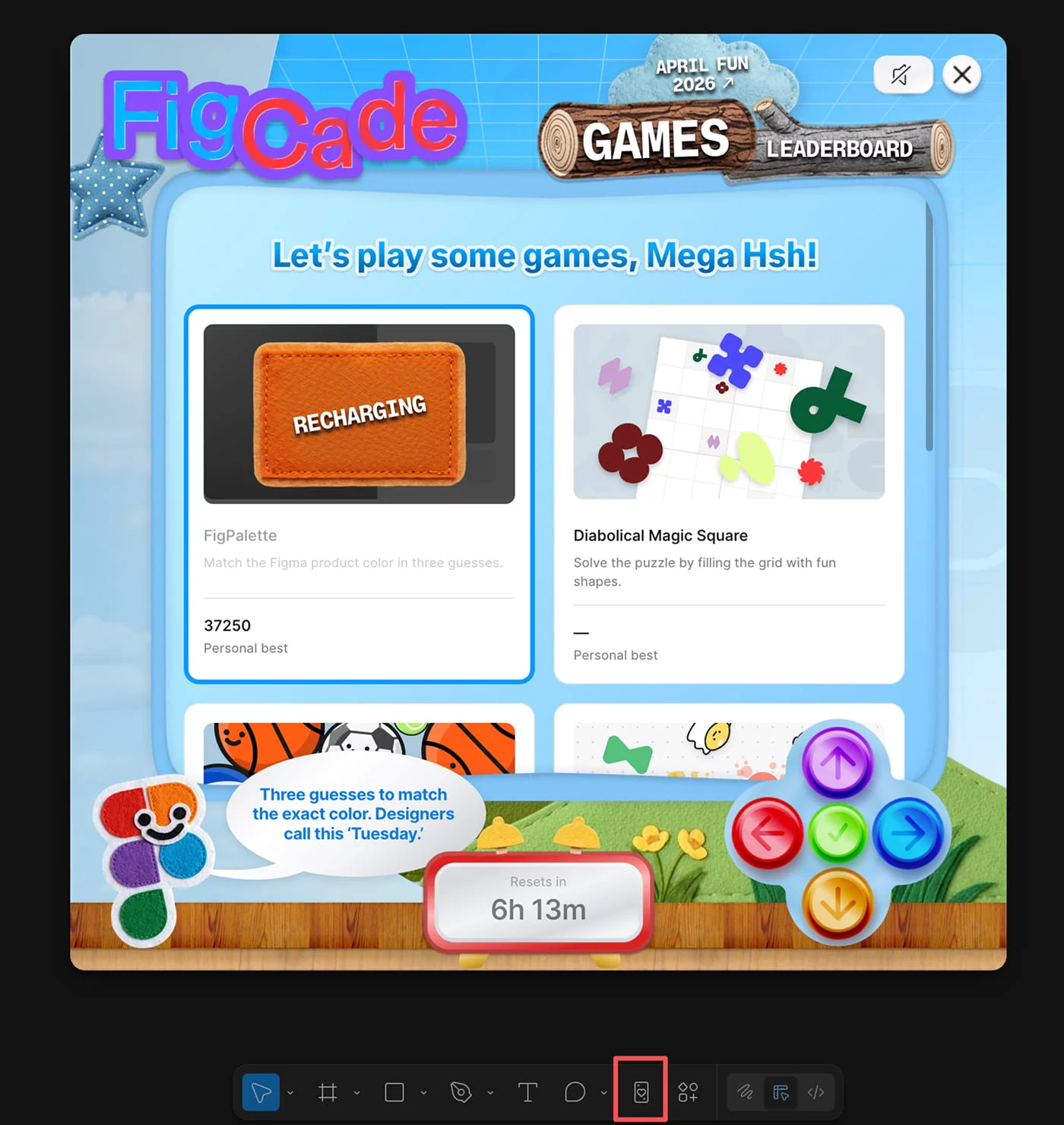 Figma 延续了每年的愚人节传统(April Fun Day),上线了一个名为 FigCade 的限时小游戏中心,就在工具栏底部的小心心图标里,一共 6 款设计师专属游戏:📅 限时开放: 4 月 1 日 - 4 月 7 日 右下角的果冻手柄手感绝了,趁着没下线快去体验下「设计师的周二」! Figma 是一个严肃的协作设计工具,工具栏是最核心的生产区域,突然在这里开一个游戏厅,反差感拉满。而且游戏主题全部是设计师的职业技能——猜颜色、拼形状、配色匹配——玩的时候会有一种「我在用专业能力打游戏」的爽感,摸鱼都摸得理直气壮。
