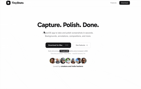 TinyShots 的官网只放了一个动画,但看完这个动画你就完全不需要读任何文字了——截图丢进去,自动变成精致的展示图,三秒完事。这大概是我见过把「产品即演示」做得最干净的独立开发者官网。 这个动画同时承担了三重角色:产品说明(干什么的)、效果演示(做出来什么样)、复杂度预期(操作有多简单)。传统做法需要截图、文案、甚至教学视频三种素材才能传达的信息,一个动画全部覆盖了。