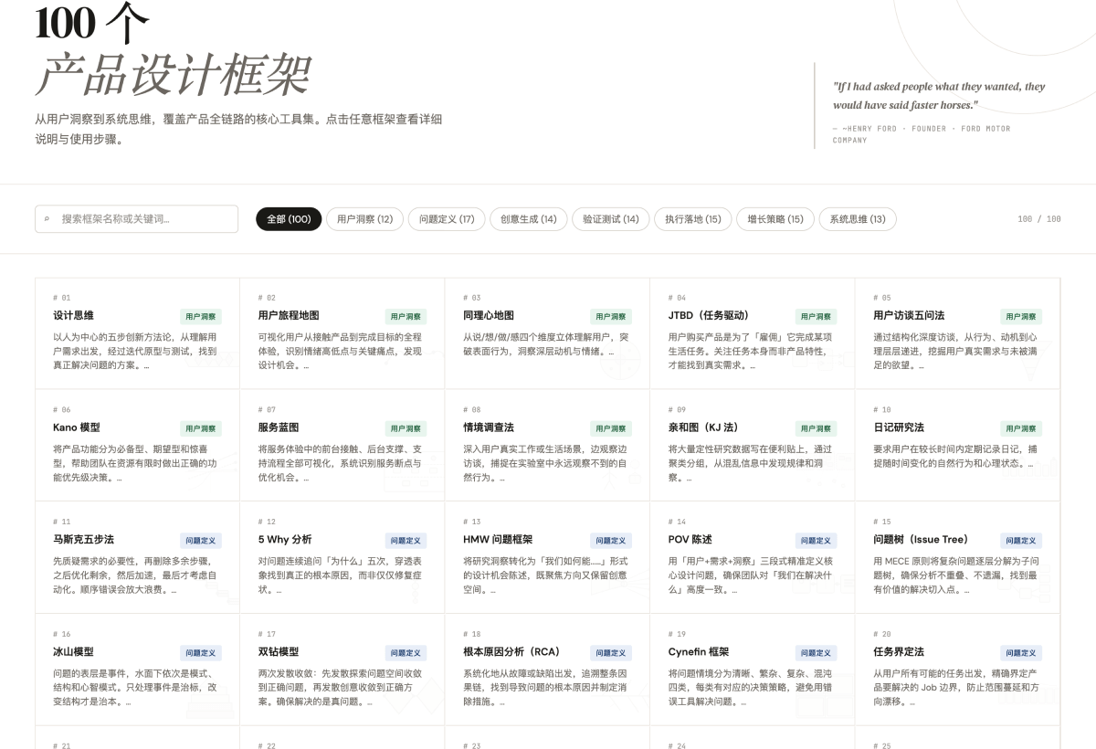 给产品经理、设计师备的「框架字典」,从用户调研、问题拆解,到创意、验证、执行、增长、系统思维,整整 100 个方法全都列出来了。每个条目都有一句精炼解释和分类标签,点进去还能看详细说明。