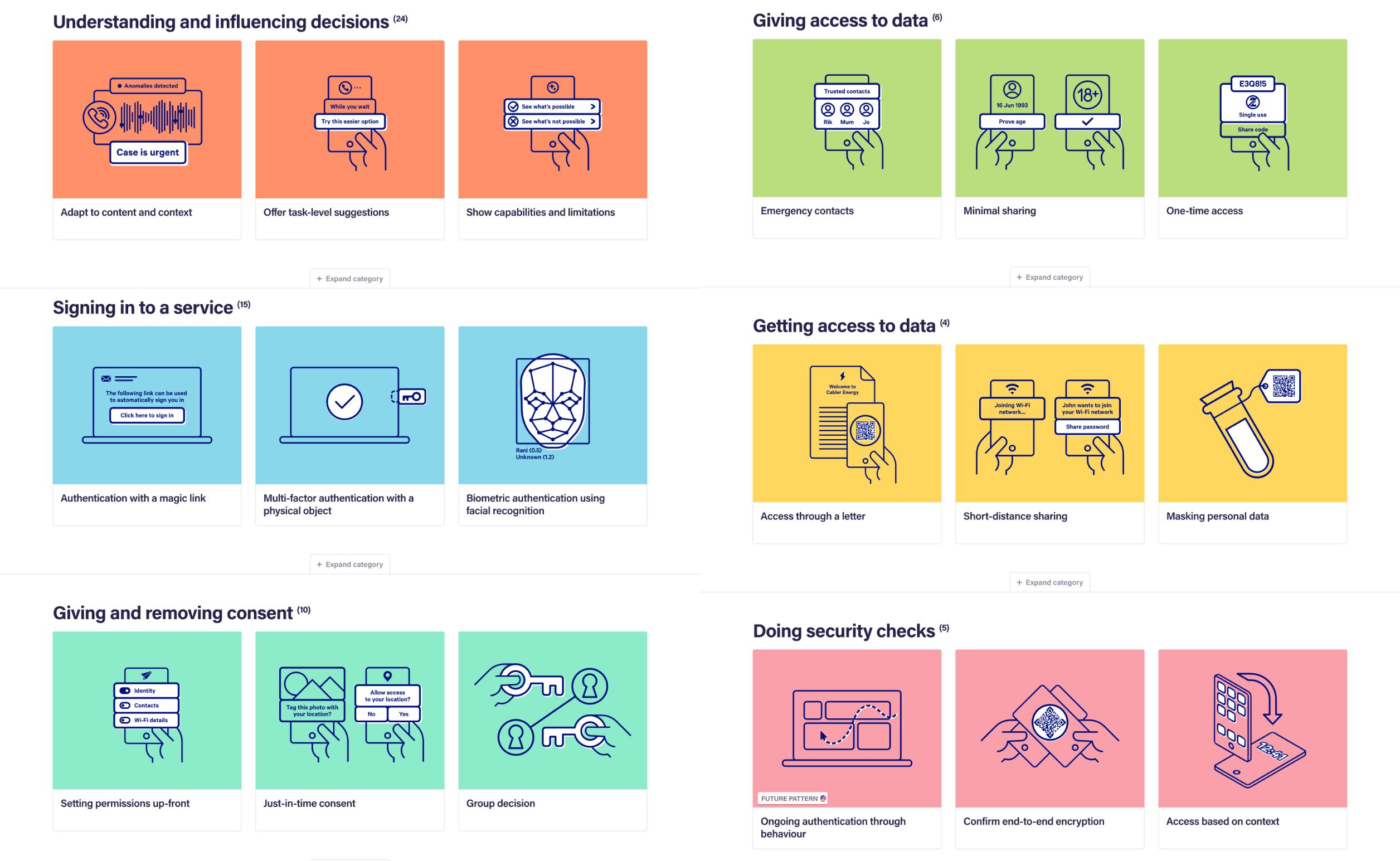 专门收集怎么在产品里处理登录、安全、授权、AI 透明度、隐私和用户决策这些问题的具体交互方案。不是那种纯概念白皮书,而是一张张「模式卡片」:场景一句话 + 解决方式,比如魔法链接登录、一次性访问、行为持续认证、AI 能力说明、同意撤回日志等等。说白了,就是帮你少踩信任和合规的大坑,同时产品又不会做成「政务网站味」那种反人类体验。