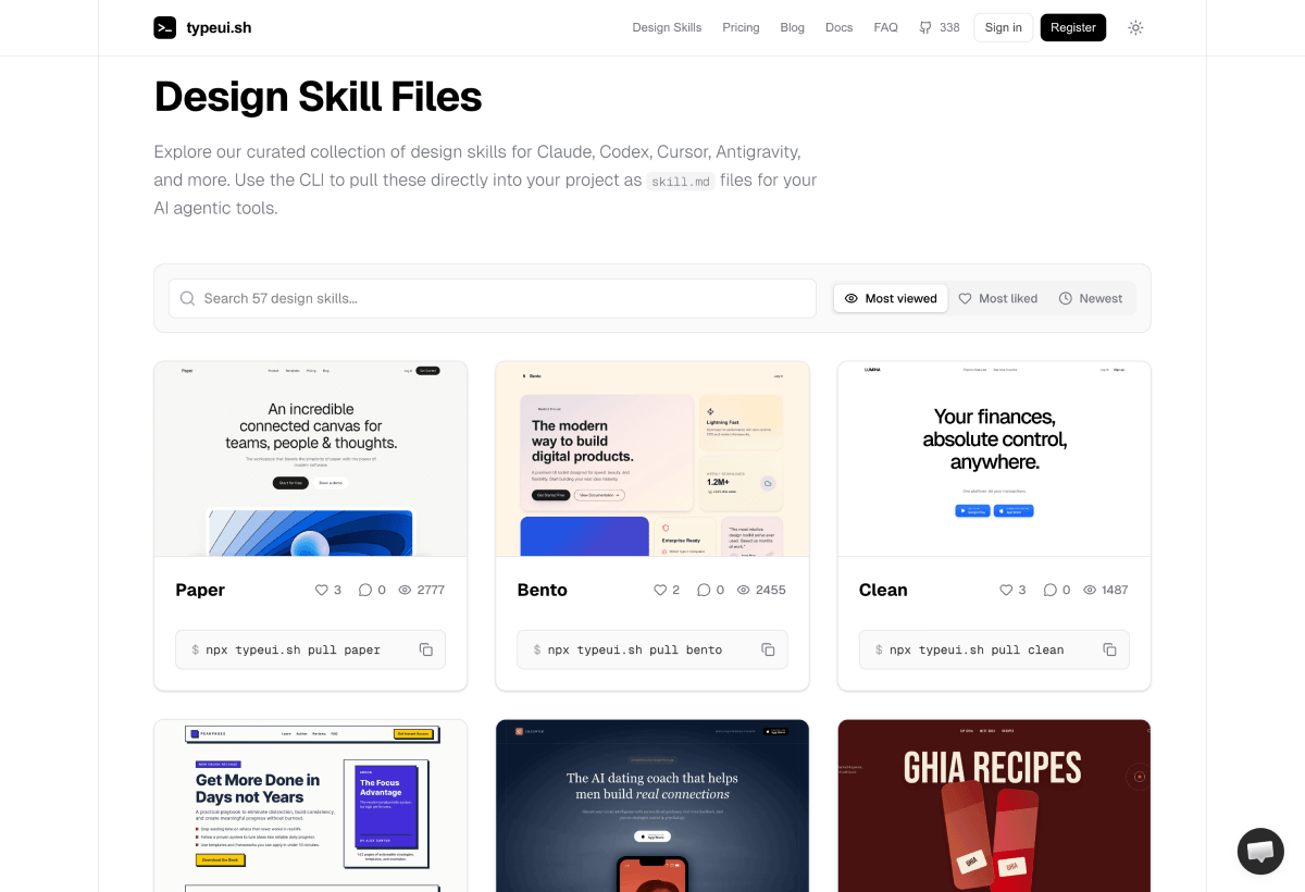 typeui.sh就是给各种 AI 写代码工具(Cursor、Claude Code、Windsurf 那些)统一上设计皮肤的命令行小工具。用一份叫「design skill」的配置,把颜色、间距、组件风格这些前端设计规范固化下来,让不同模型、不同 IDE 生成出来的 UI 不再东一榔头西一棒子。目前有 50 多套预制风格(Paper、Bento、Neobrutalism 等),开源 CLI 免费用,高级版卖「增强 skill」「团队私有仓库」「Figma 插件」这类增值服务。整体感觉:挺对趋势、切口也聪明。