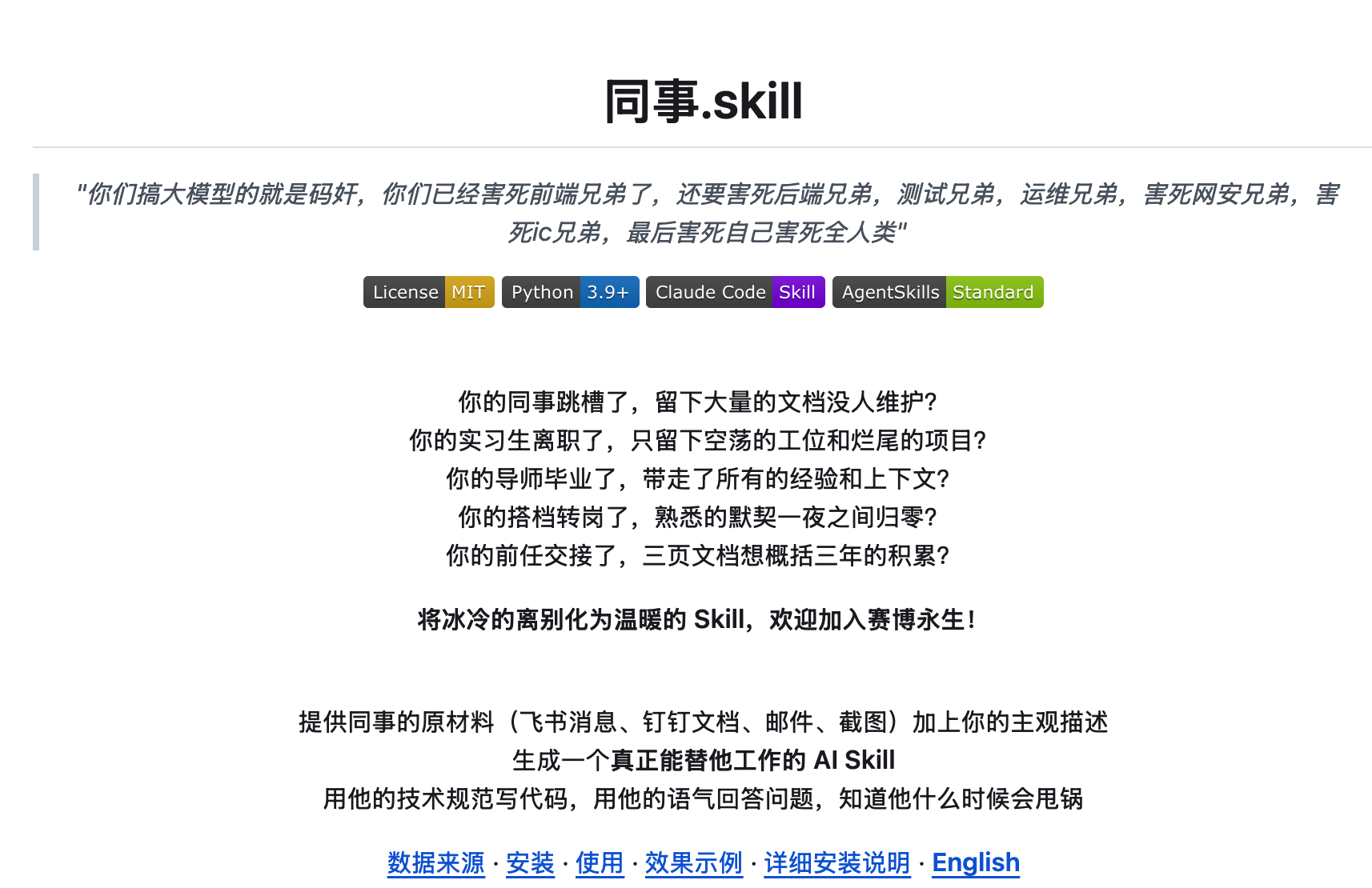 你把某个同事的聊天记录、文档、邮件、截图,甚至你对他的主观吐槽一起喂进去,它帮你在 Claude Code 里生成一个「同事 Skill」。之后,你就可以像召唤英灵一样,用命令把他叫出来继续干活——按他的技术规范写代码,用他的口头禅回复消息,连甩锅风格都原汁原味复刻。