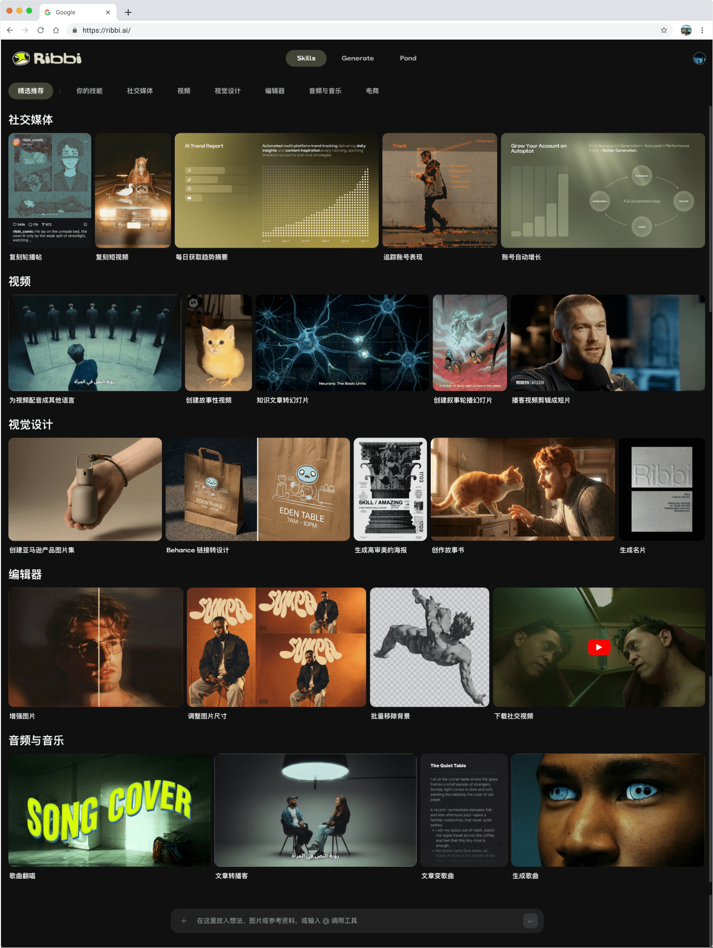 Ribbi不一样。它想的是你做创意这件事——从第一张参考图,到最后一条数据复盘,把整条链都接住,不让你掉出去、不让你分心。