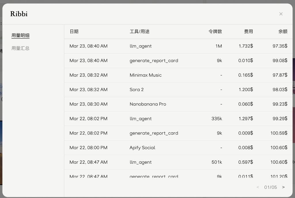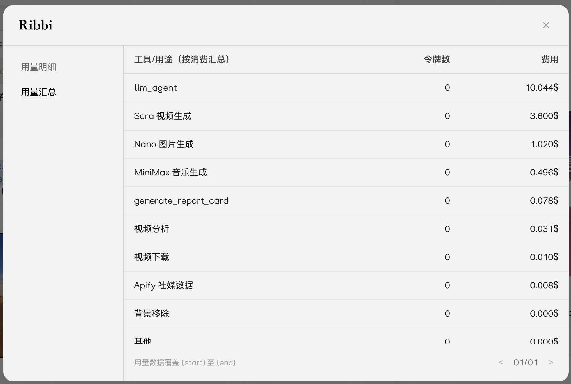 账单里能看出来,Ribbi其实是在自动挑最合适的模型来干不同的活。比如逻辑处理用 llm_agent,生视频用 Sora 2,生音乐用 Minimax Music,抓社媒数据用 Apify Social。