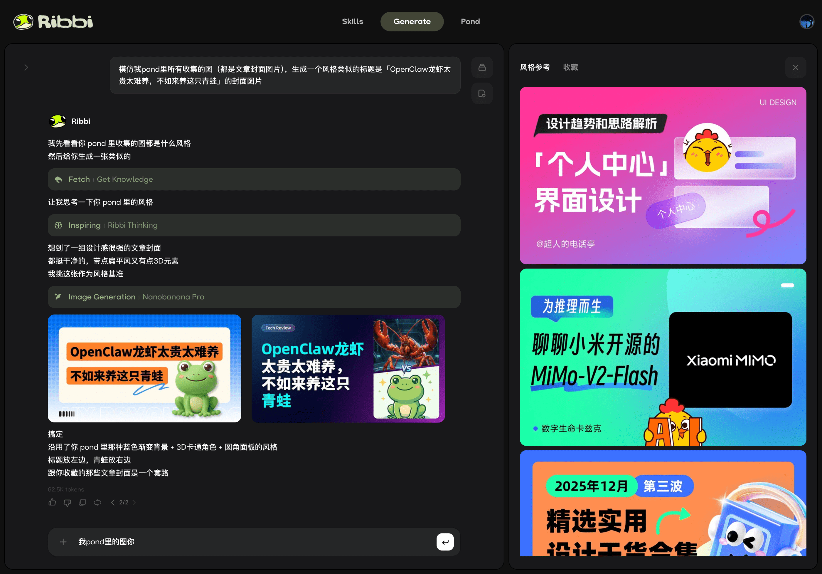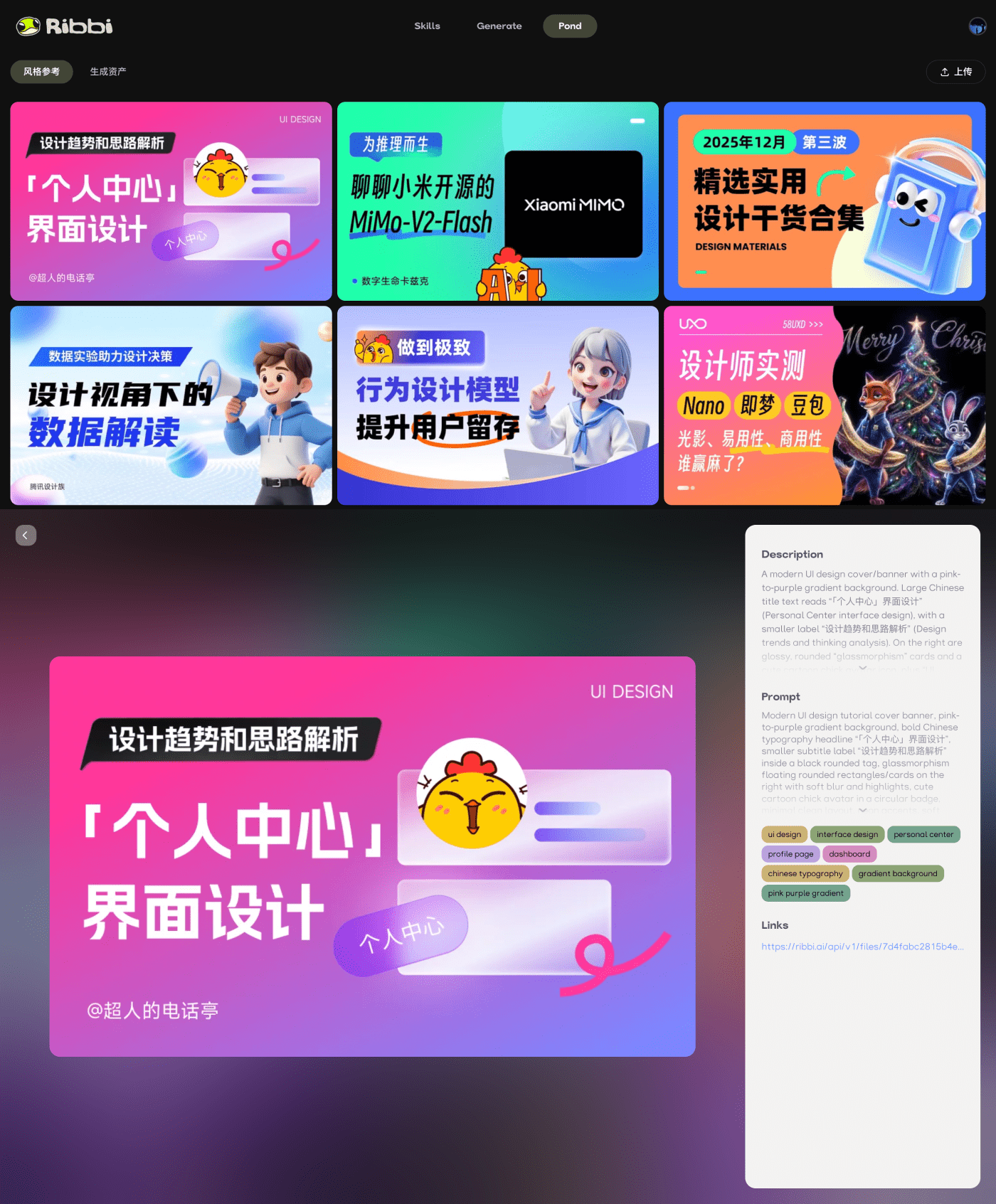 比如我对Ribbi说「帮我做张文章封面」,出来的东西会带着我平时收藏到Pond里优设的封面那种味道,一致性很高。