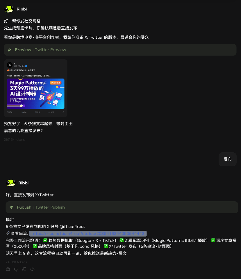 - 直接发到你的社交账号。我这里发的是图文,当然你想让Ribbi生成视频也OK,发布渠道也不止X(Twitter),YouTube、Instagram、Tiktok都行。