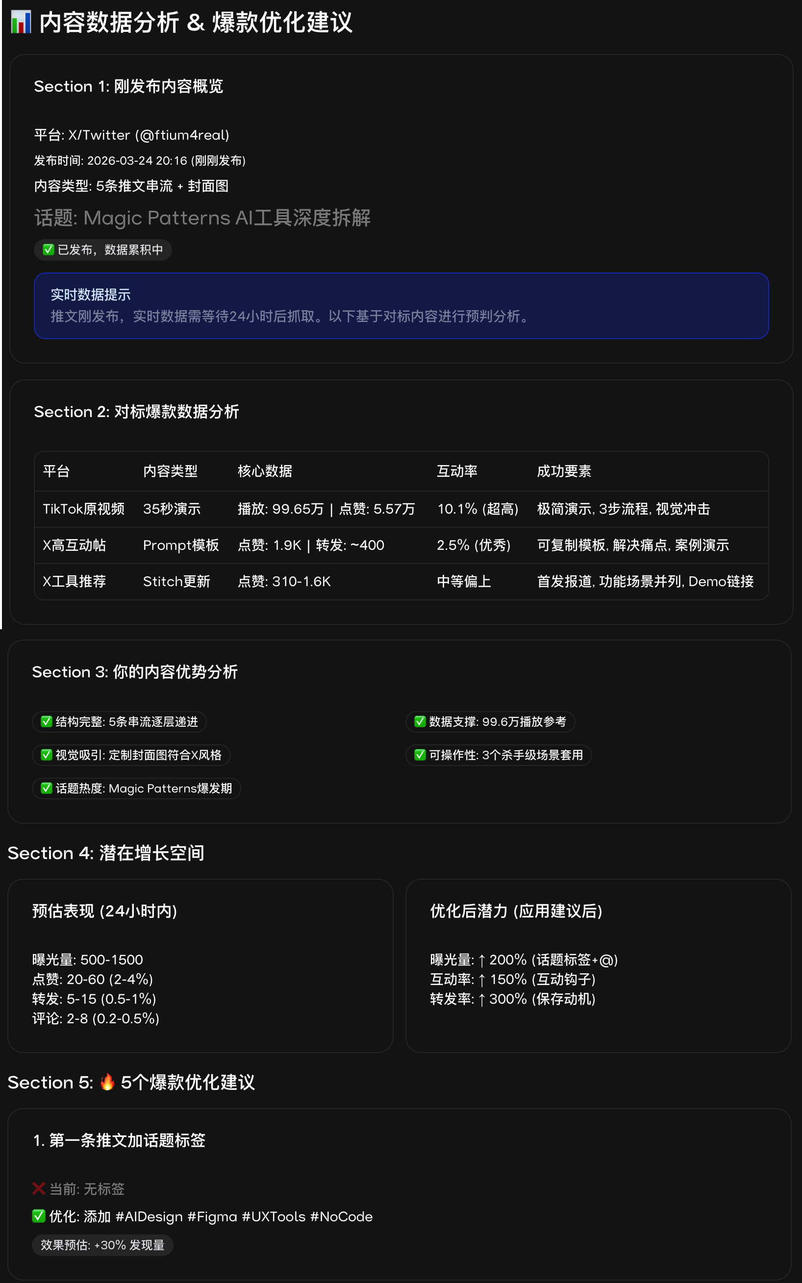 - 睡一觉起来,它已经用 generate_report_card 帮你整理好这批内容的数据,甚至还给你一些爆款建议。
