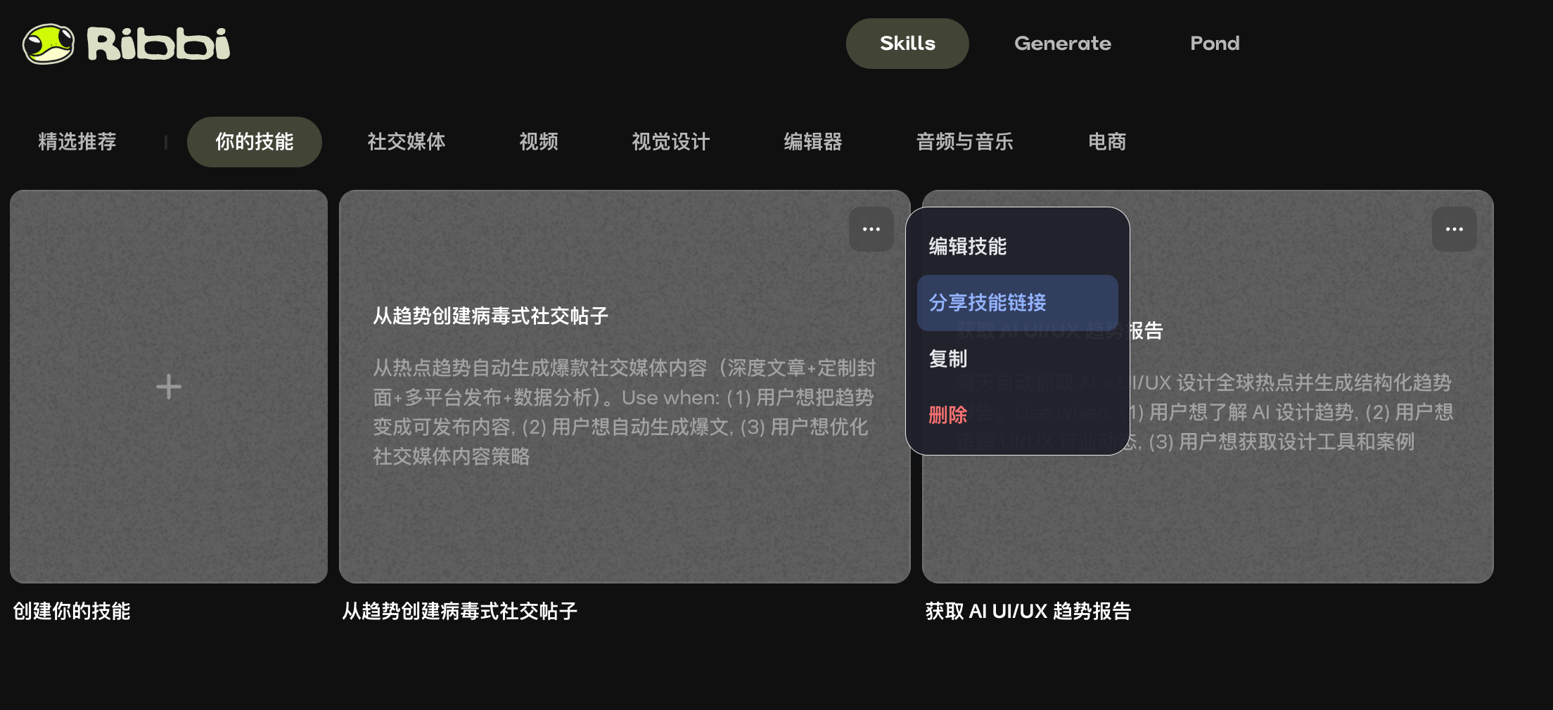 你在聊天框里跟Ribbi一步步对话,它跑几次之后就会自己记住,把你这套流程封装成一个专属 Skill(技能)。