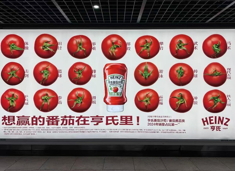 但亨氏的这个广告,却把它们完美地融合在了一起,效果出奇地好。 这个亨氏的地铁广告设计,在视觉上极具冲击力。首先,整个画面以大面积的白色为底,凸显出数十个饱满、鲜红的番茄,色彩对比强烈,有效抓住了来往行人的注意力。布局上,广告采用了一种严谨的网格化排列,将形态各异的「运动番茄」们整齐地展示出来,环绕着位于画面中心的亨氏番茄酱产品,使得视觉焦点明确。最核心的创意在于,设计师巧妙地利用了番茄顶部的绿色萼片,将其塑造成了不同体育项目运动员的剪影,比如体操、游泳、击剑、攀岩等,形态生动,富有动感。