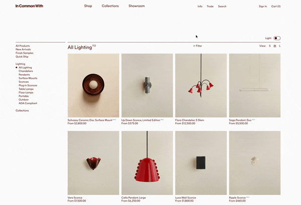 深色模式难道不就是把背景色从白色改成黑色吗?如果你这么想,In Common With的设计会彻底颠覆你的认知。这个销售灯具的网站告诉我们:真正的深色模式,不是简单的配色切换,而是整个视觉情境的重构。 默认状态下,页面是浅色背景,所有灯具产品图都像在白天拍摄的一样,灯是关闭的。当用户切换到深色模式后,神奇的事情发生了:整个网页的背景会平滑地过渡到深色。但更关键的是,页面中所有的灯具图片,都同步切换成了在黑暗环境中点亮发光的样子。每一盏灯都散发着自己独特的光晕,用户能直观地看到灯光的效果、色温和氛围感。 完美解决了线上购买灯具最大的痛点——无法预览真实光效。用户不再需要猜测,可以直接看到产品在“夜间模式”下的核心表现。