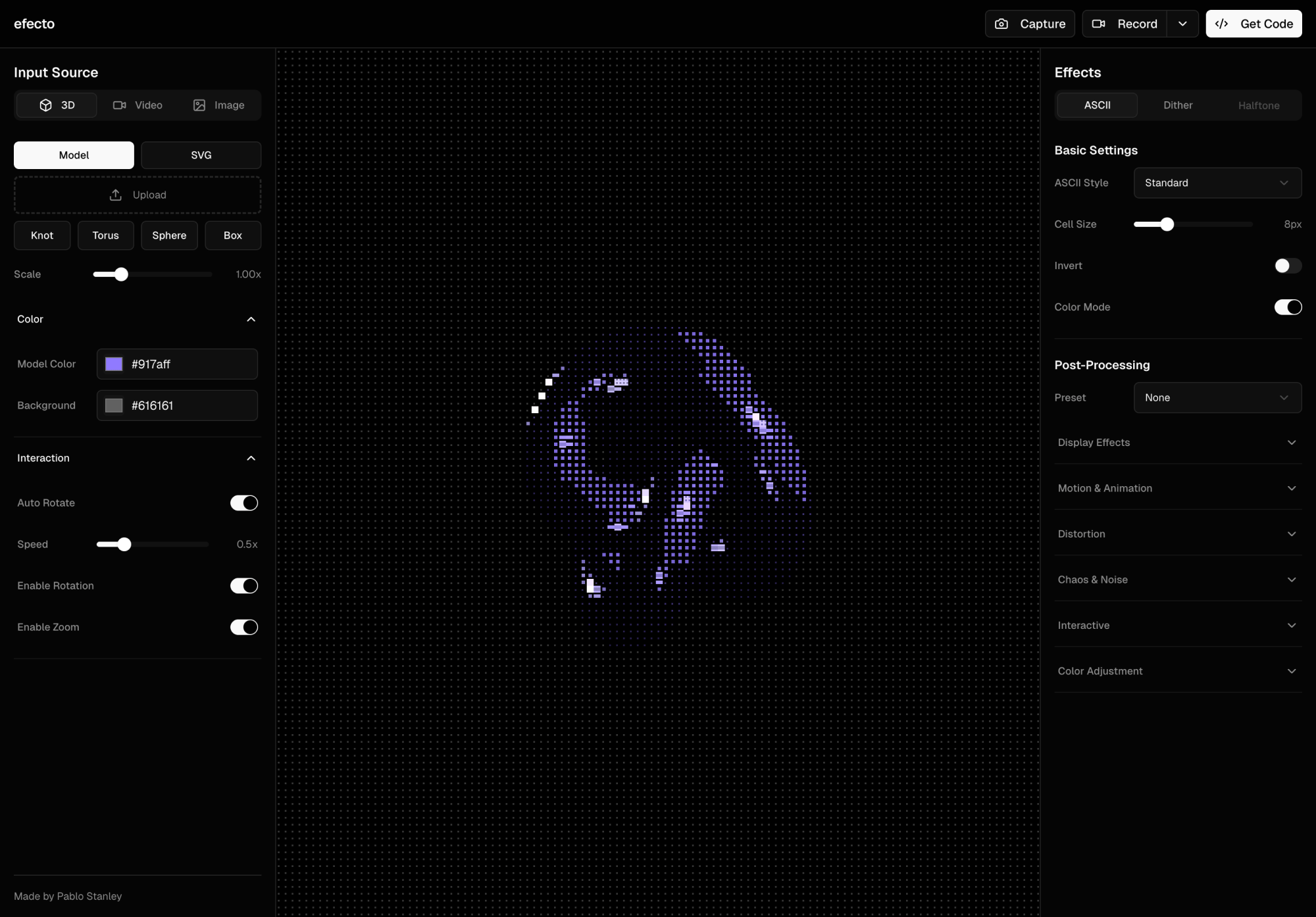 让用户能够实时应用各种惊艳的效果,如 ASCII 艺术、抖动和半色调等。无论是 3D 模型、视频还是图像,Efecto 都能轻松处理,并提供多种互动设置和效果选择。用户还可以自定义模型颜色、背景以及旋转、缩放等功能,极大地增强了视觉表现力。