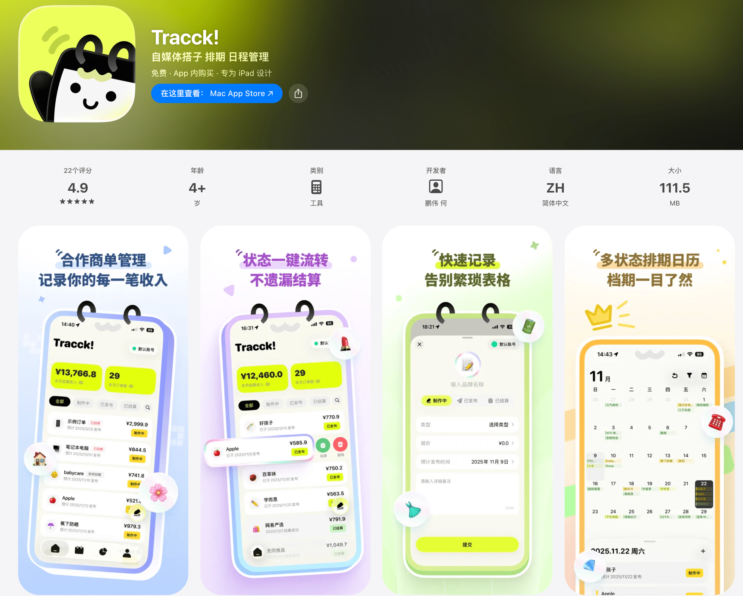 提供收入计算、订单记录和排期功能。相比于普通记账应用,Tracck!拥有清晰的商单列表和多帐号分类,帮助创作者高效管理内容合作。同时,数据分析功能让收入趋势一目了然。无论你是博主、画师还是设计师,Tracck!都能成为你创作路上的最佳搭子。
