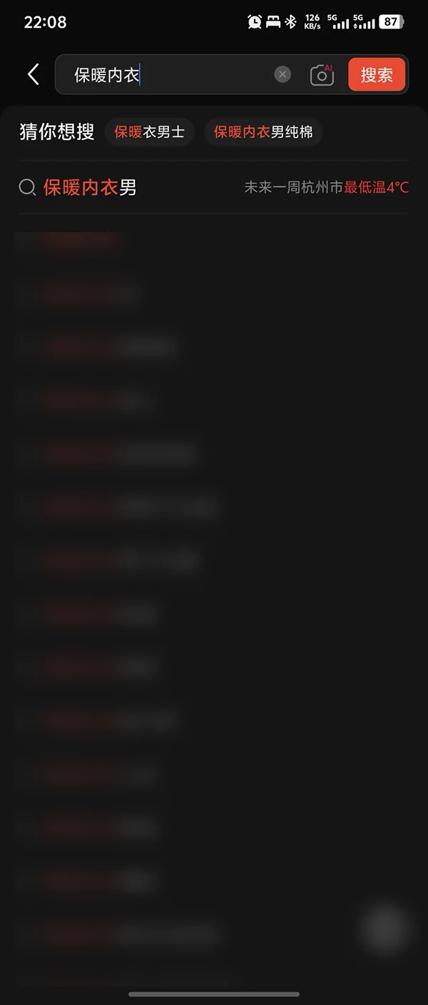 当你在电商APP里搜索商品时,通常只期待看到商品列表,对吧?但在这个案例里,搜索框旁边却莫名其妙出现了一行天气预报。 我在京东搜索框输入了关键词「保暖内衣」。系统在后台实时监测用户的输入内容,当识别到「保暖内衣、羽绒服」等强季节性、强温度敏感型关键词时,系统迅速调用地理位置API和天气数据接口,在搜索建议页动态展示当前用户所在地的气温预测。潜台词是「天要冻死人了,赶紧买,还要买厚的」。这种心理暗示能有效缩短用户的犹豫时间,提高下单转化率,甚至引导用户购买客单价更高的加厚款产品。