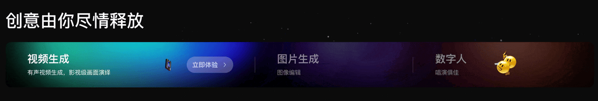 打开通义万相的首页,映入眼帘的是3个横向排列的功能卡片区域,右侧的图标并未采用传统的 2D 扁平风格,而是使用了极具质感的高保真 3D 渲染素材。最巧妙的地方在于,这些卡片并非静态陈列,而是会像轮播图一样自动切换。每隔几秒,3个卡片会平滑地向左滑动,原本在左侧的卡片滑出视野,而新的卡片从右侧优雅地滑入。动态展示比静态陈列更能吸引注意力,用户会不自觉地多停留几秒观察轮播效果,这增加了功能被发现的概率。这是一个既是导航入口,又是轮播展示的混合体。