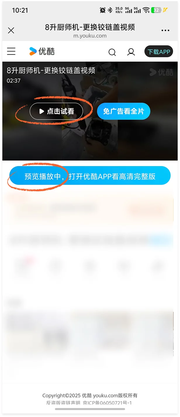 明明能看完整版视频,为什么要告诉用户这只是预览? 优酷H5耐人寻味的设计,播放键上并非单纯的三角形图标,而是硬生生加上了「试看」二字;底部蓝色通栏按钮更是用「预览播放中」这种具有时间紧迫感和残缺感的词汇,配合「打开优酷APP看高清完整版」的引导语。