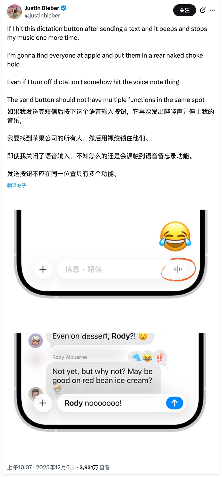 咱们来扒扒这个让人火大的小细节。在iMessage中,麦克风图标和发送按钮都在输入框的右边位置。当输入框中没有文字时显示麦克风图标,有文字时才变成发送按钮。用户习惯了「右下角=发送」的肌肉记忆,这导致用户在准备点击「发送」的位置时,如果输入框恰好是空的,就会误触麦克风功能。 一误触就糟了:正在放的歌或者音频立马停了,麦克风直接被调用,屏幕还唰地切到语音输入界面,真的瞬间火大。 比伯吐槽里有个点我特别有共鸣,真的巨反人类——就算你在系统设置里把听写、语音输入全关了,那个麦克风图标还在那儿杵着,而且照样能被按到!只不过按完会弹个「语音输入已禁用」的提示。合着我就算提前设防,该被打断听歌还是会被打断,这设计真的没谁了。