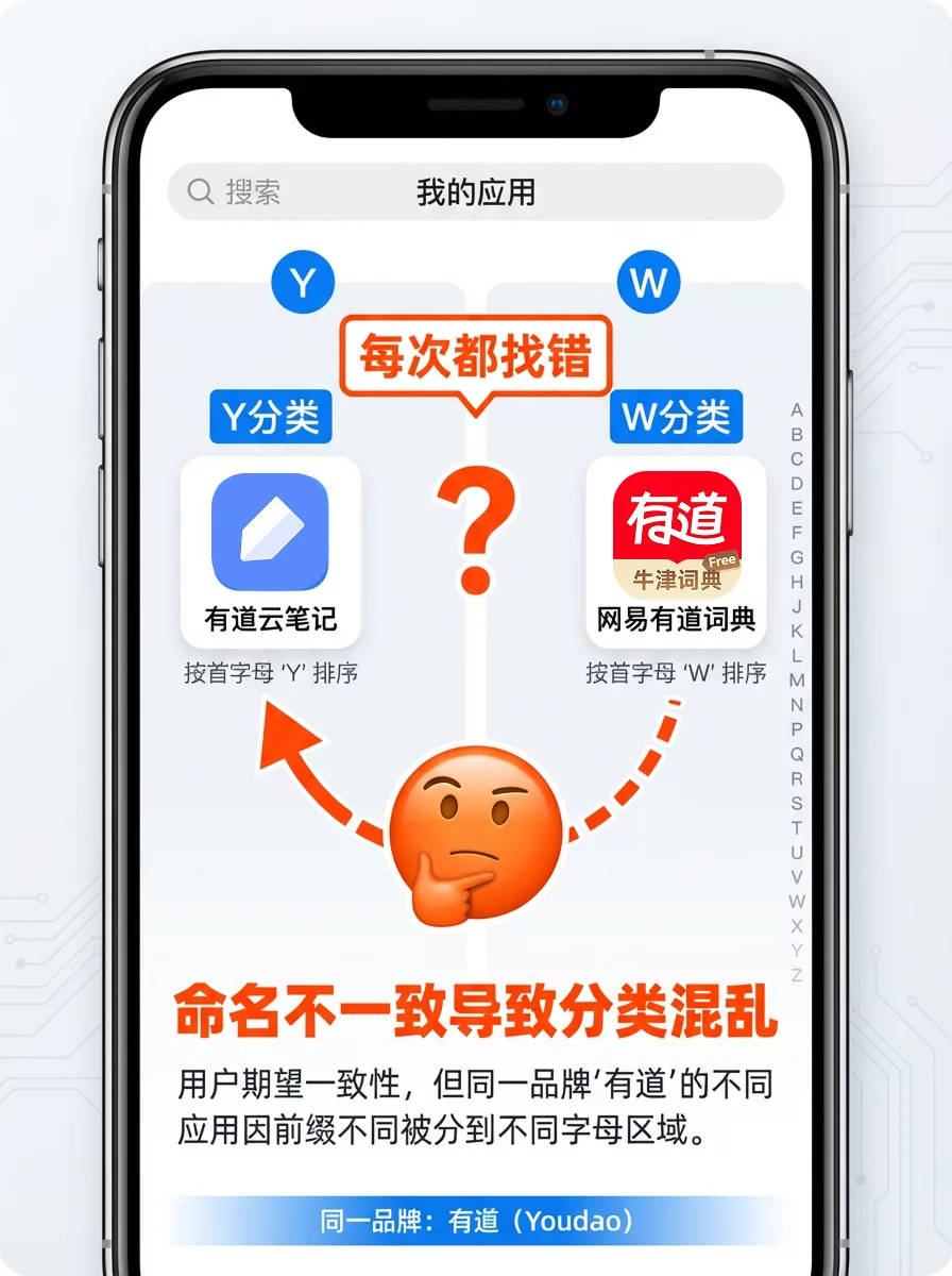 用户在使用手机时,会基于经验建立起一套「心智捷径」——比如记住某个品牌的产品通常在哪个字母分类下。但当同一品牌的产品散落在不同字母区时,这套捷径就失效了。用户需要在每次查找时重新思考「这个App到底叫什么名字开头」,增加了不必要的认知负担。
