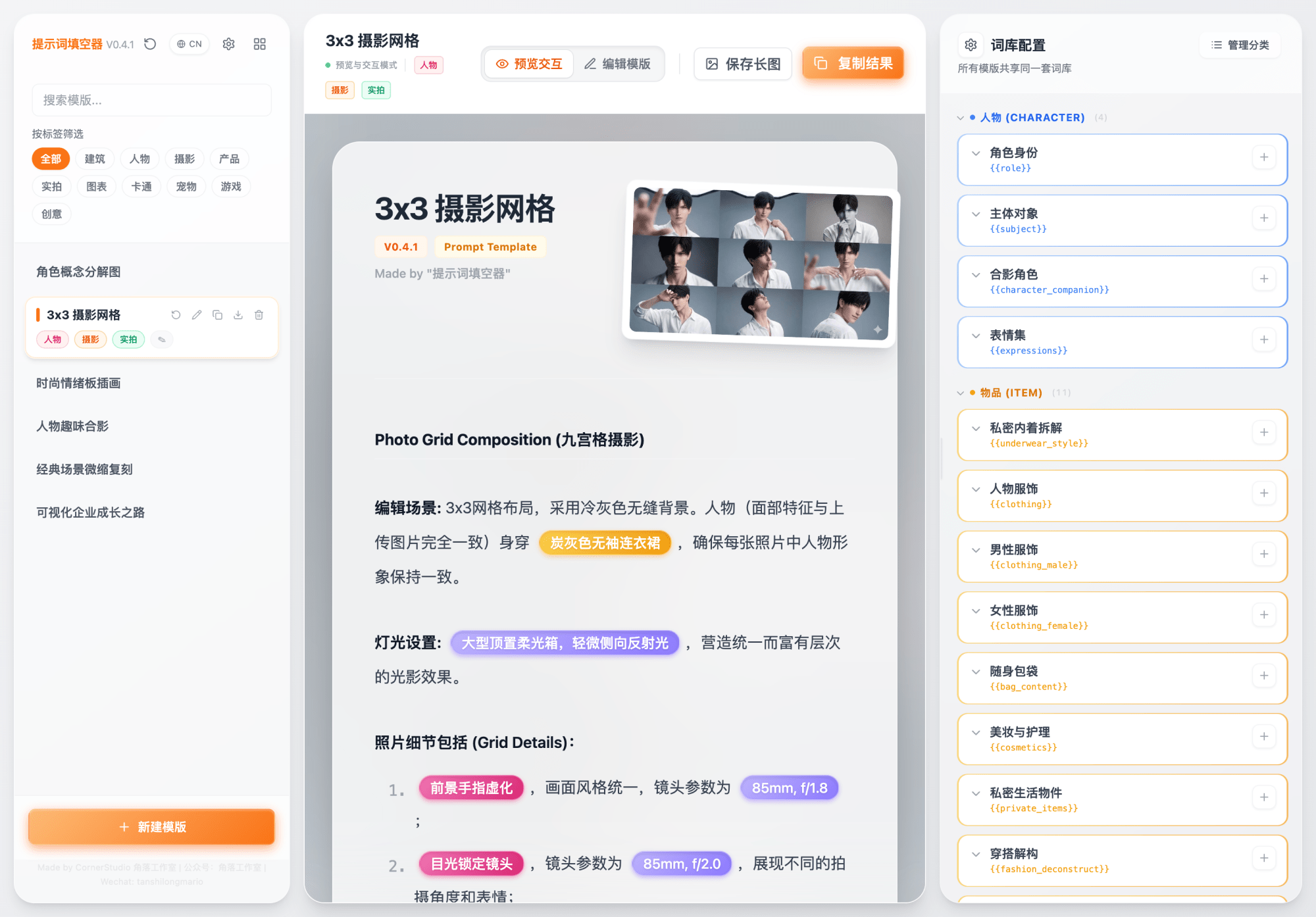 把常见AI生成内容的场景打包成结构化的提示词,你只要选择不同维度,就能填充属于自己的提示词模板,快速让AI生成某种指定类型的内容。