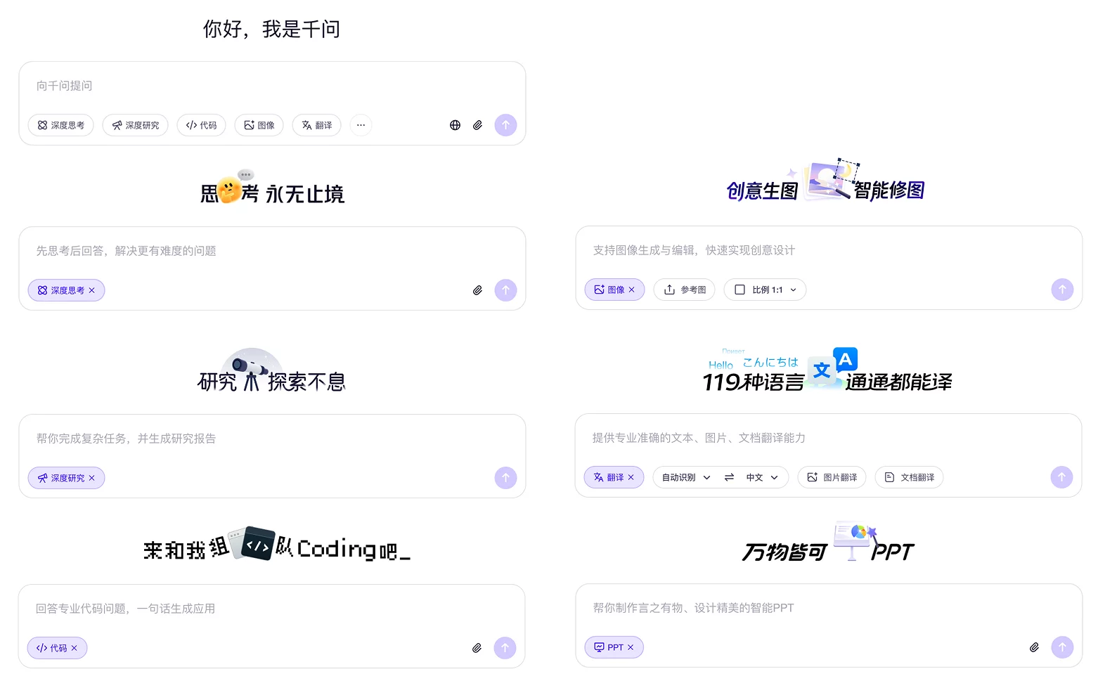 在通义千问网页版,一旦用户点击下方的功能tag(如深度思考、代码、图像等),顶部的Doodle区域就会发生显著的视觉变形,每个插图的设计风格保持一致,采用扁平化、线性图标的视觉语言,色彩以品牌紫色为主色调,既保证了视觉连贯性,又通过不同的图形符号实现了功能差异化表达。